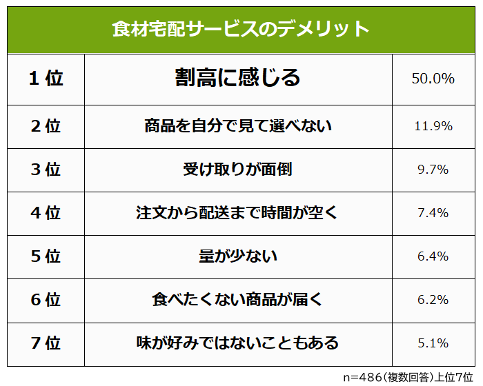 食材宅配サービスのデメリットの1位は「割高に感じる(50.0%)」です。2位「商品を自分で見て選べない(11.9%)」、3位「受け取りが面倒(9.7%)」、4位「注文から配送まで時間が空く(7.4%)」が続きます。