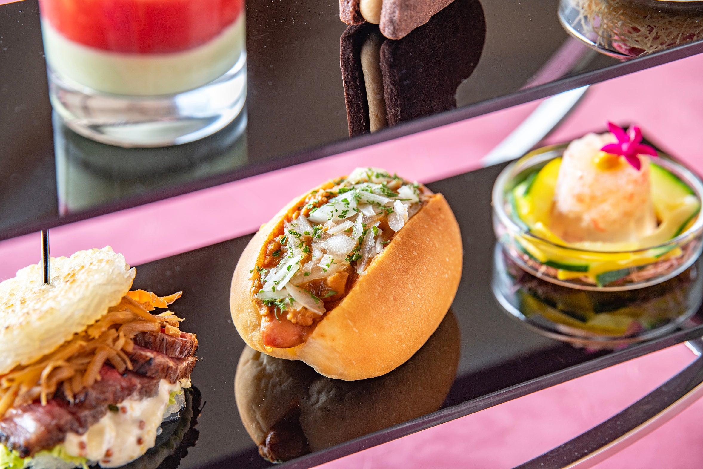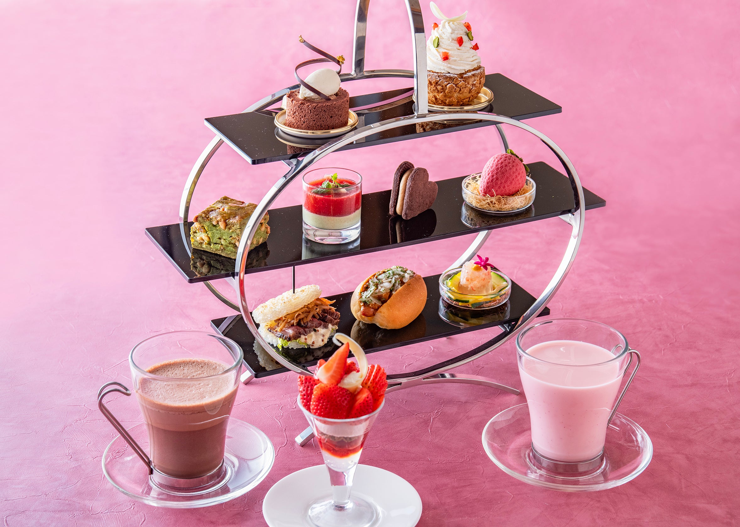 すべてのアイテムを自家製にこだわり、パティシエ・ブーランジェ・シェフの技と感性を結集した華やかなラインナップです。しっとりと焼き上げたスコーンやミニライスバーガー、ミニドックなどのセイボリー、ハート型やいちごに見立てた愛らしいスイーツを盛り込んだ3段スタンドに加え、上から下まであまおうを贅沢に使ったミニパフェもお楽しみいただけます。