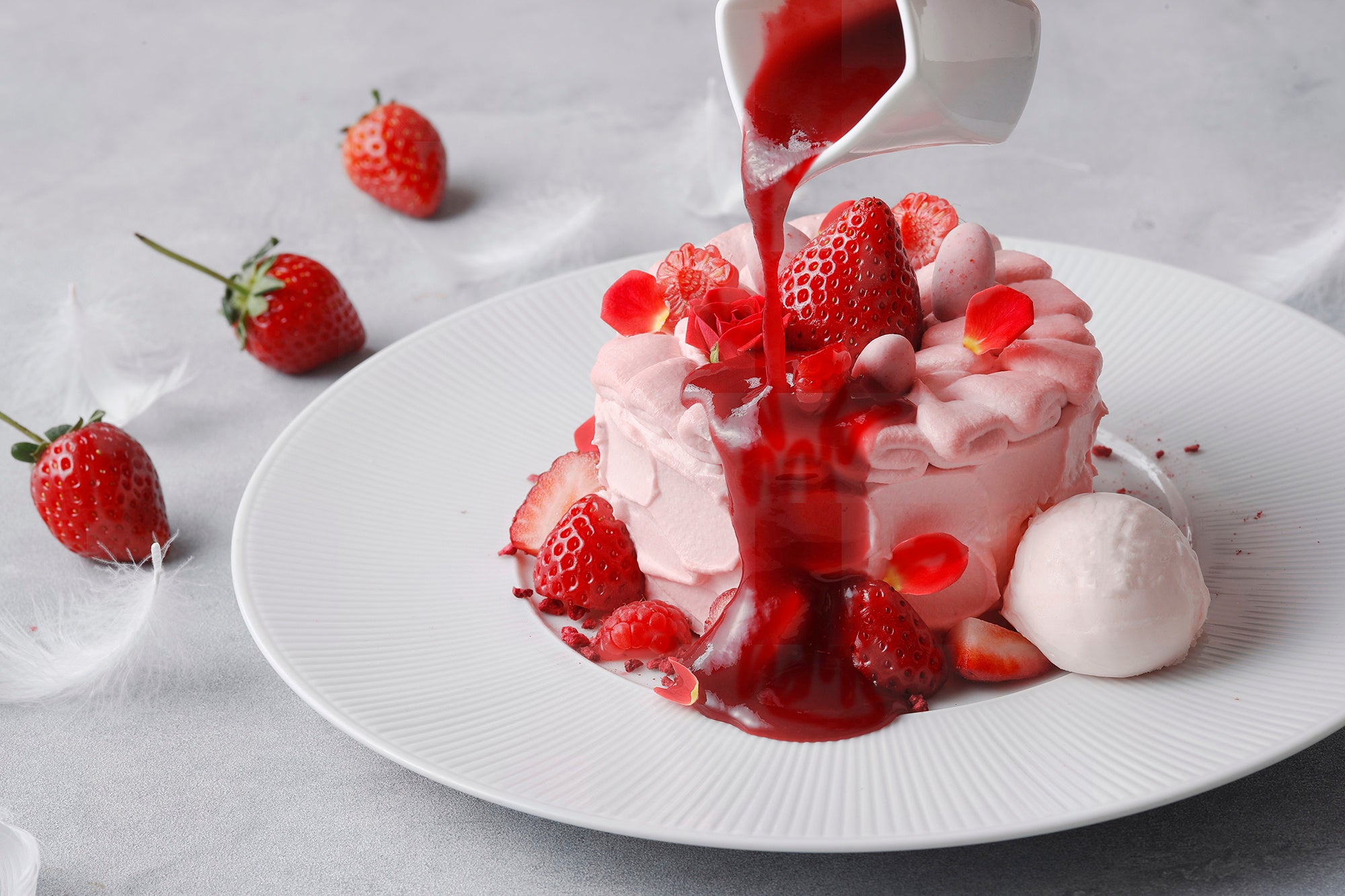 別添えのフランボワーズソースをかけると、濃淡の美しいグラデーションをお楽しみいただける。