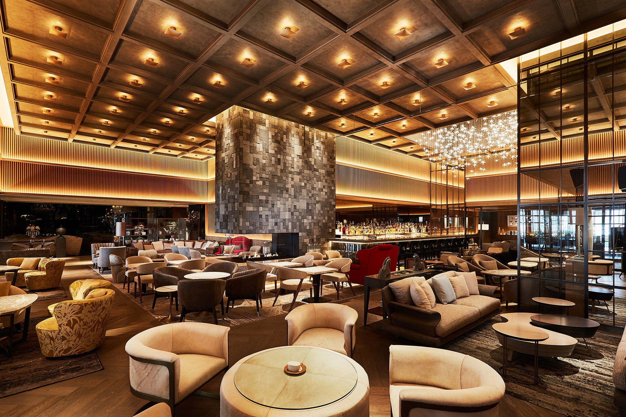 2020年にグランドオープンした「逢う・集う・囲む」をコンセプトにした開放的かつダイナミックなラウンジ&バー。天井高5mの「火を囲む暖炉のあるラウンジ」を空間の中心とし、7mのカウンターを備え、光と影が演出するアーティスティックで魅惑的なバーエリア「アンバー」と、ソファー席や洛中洛外図を設置したラウンジエリア、ライブラリーの落ち着いた雰囲気を醸し出すエリア「ザ ライブラリー」、会食や接待、ミーティングにもご利用いただけるプライベートルーム「ライト」「エジソン」を完備した、人と人の交わる、当ホテルの新たなシンボルラウンジです。