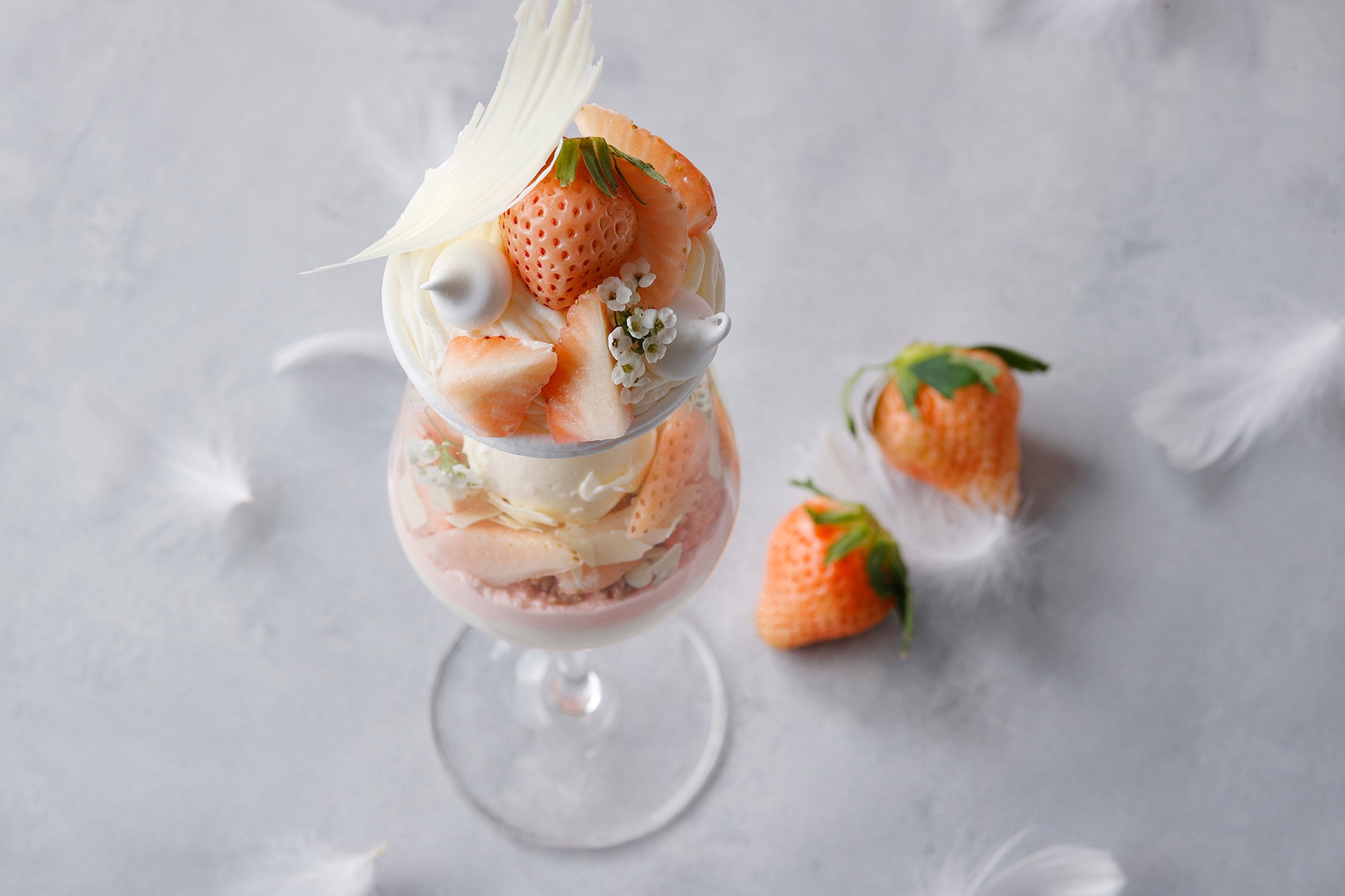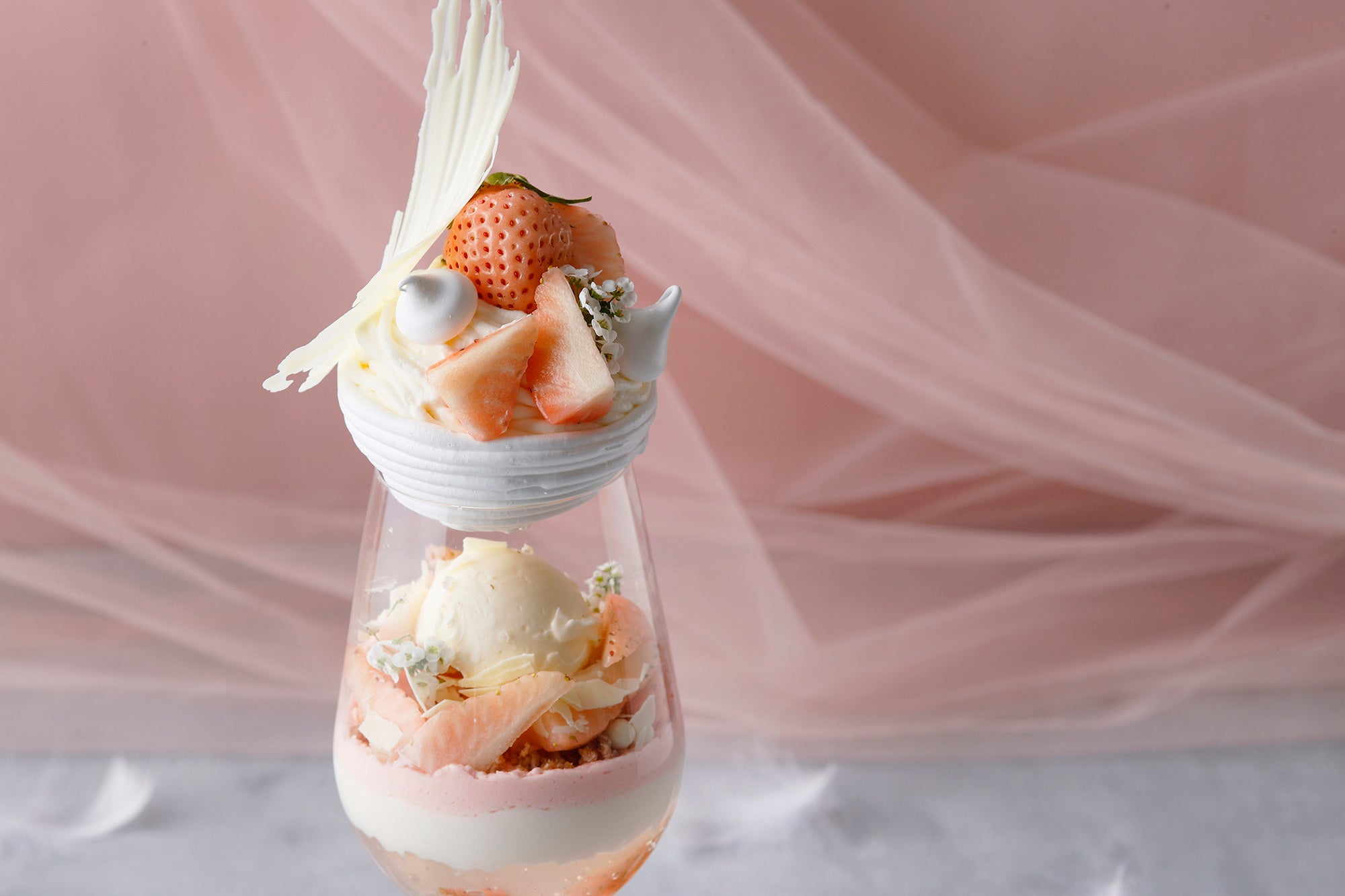 雪のように清らかな白いちごと、淡いピンクが重なり合う、エレガントな冬パフェ