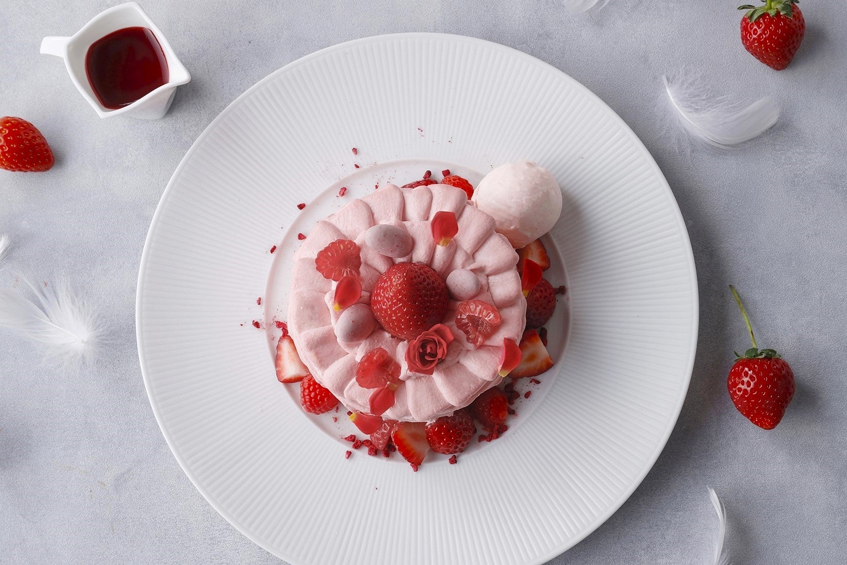 淡いピンクカラーのニュアンスがふんわりと漂う「ストロベリーロゼパンケーキ」は、チョコレート香るパンケーキ生地に、コクのあるマスカルポーネクリームと甘酸っぱいフランボワーズジャムをサンドし、いちごとローズのシャンティでやさしく包み込みました。トップには、いちごやラズベリー、ベルローズ、ストロベリーアーモンドを飾り、エレガントな世界観を演出。別添えの真っ赤なフランボワーズソースをまとわせることで、甘酸っぱさが一層引き立ち、濃淡の美しいグラデーションをお楽しみいただけます。