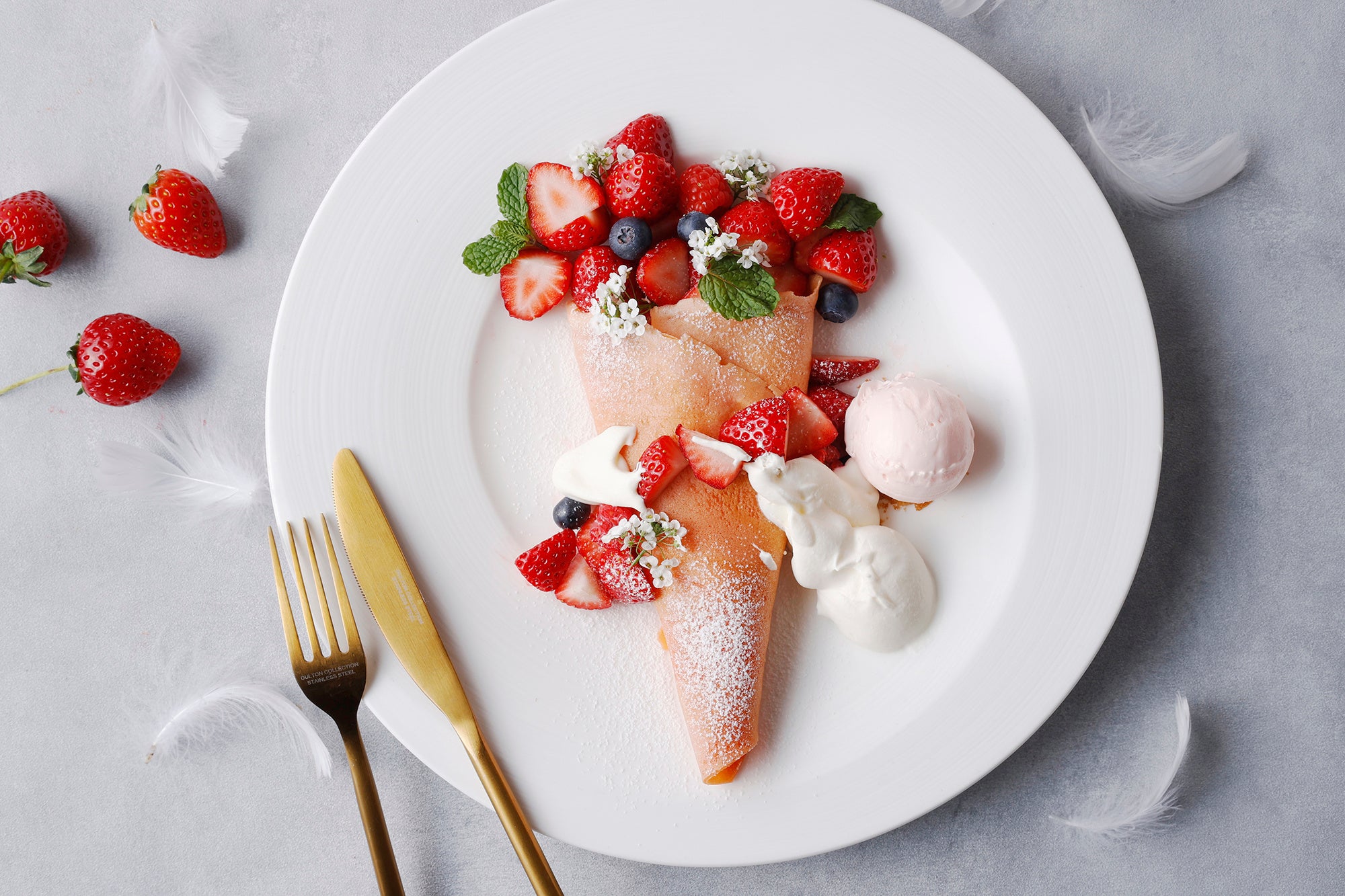 ブーケのように華やかに仕立てた、いちごクレープシュゼット