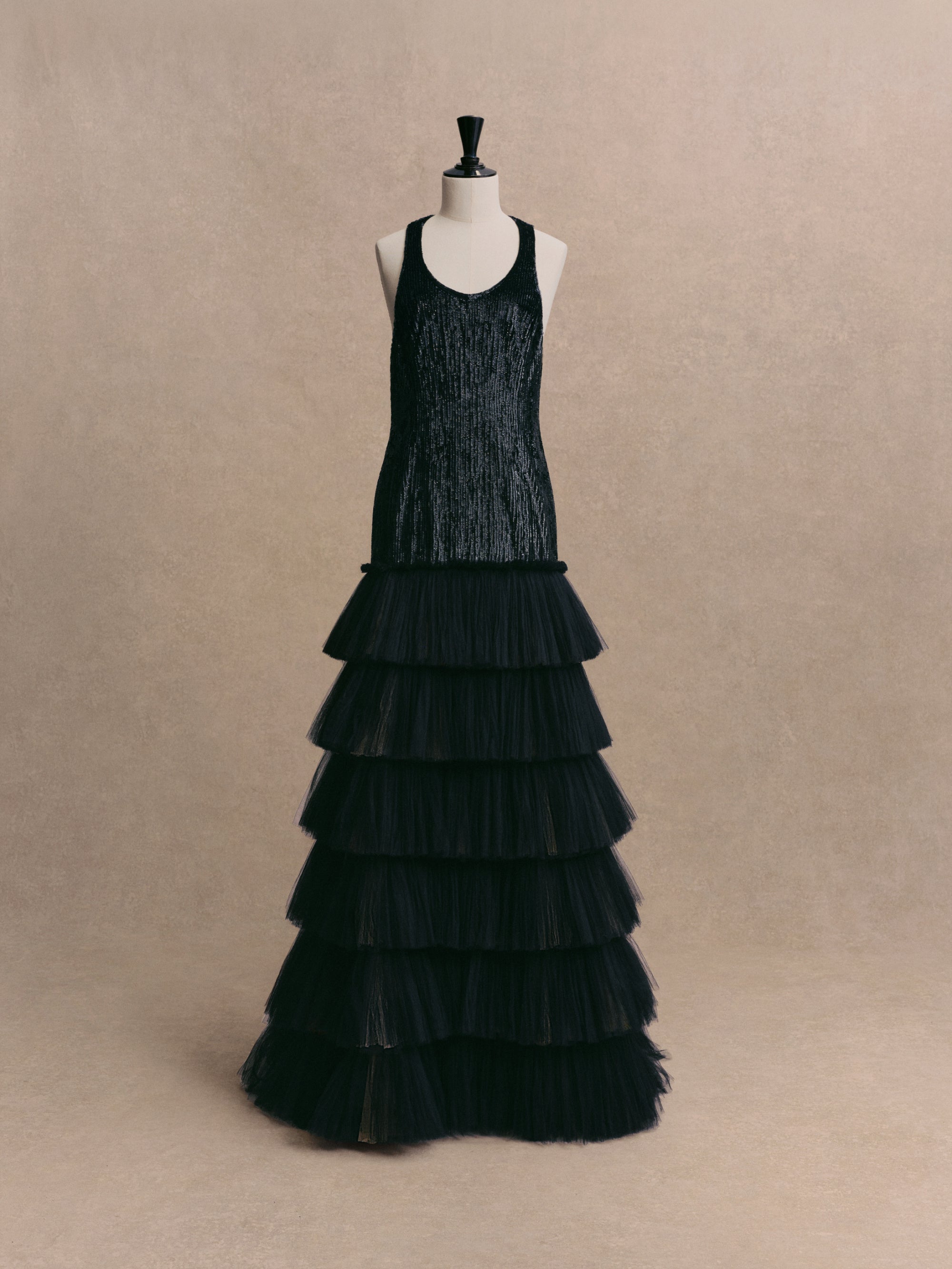 ローズ・バーンが着用したドレスは、体にフィットするボディスがヒップまで続き、デザインに沿って縦方向に並べられた光沢のあるブラックスパンコールで、すべて手刺繍されています。Aラインスカートは、ブラックのシルクチュールを重ねたギャザーフリルによって豊かなボリュームを生み出し、最初の内側の層に淡い色を用いることで、奥行きとコントラストを加えています。さらに、フリルの裁ち切り仕上げが、軽やかで幻想的な雰囲気を添えています。