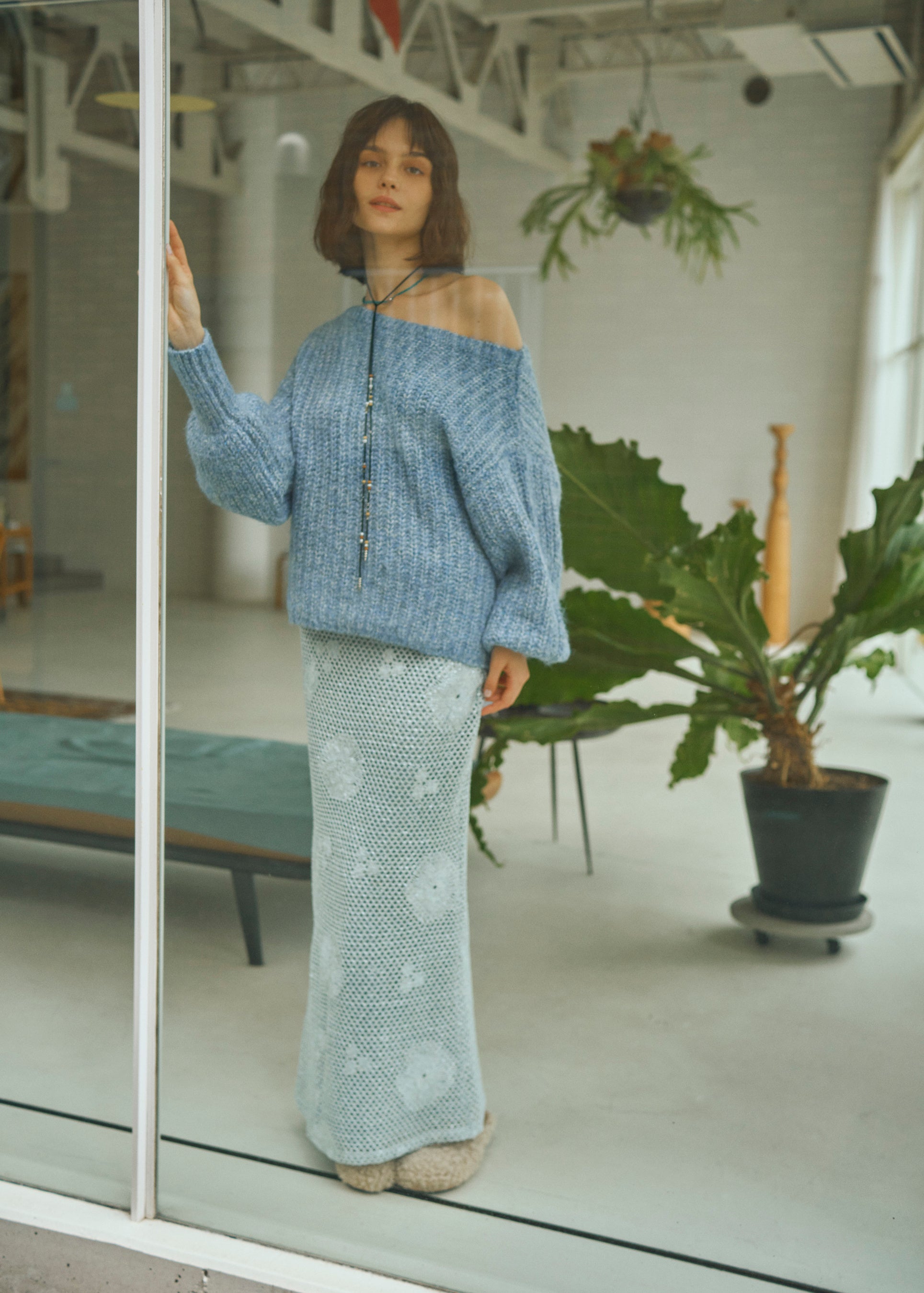 オフショルラメルーズニット 11,000円(税込) 透かし編みスパンコールレイヤードスカート 14,300円(税込)