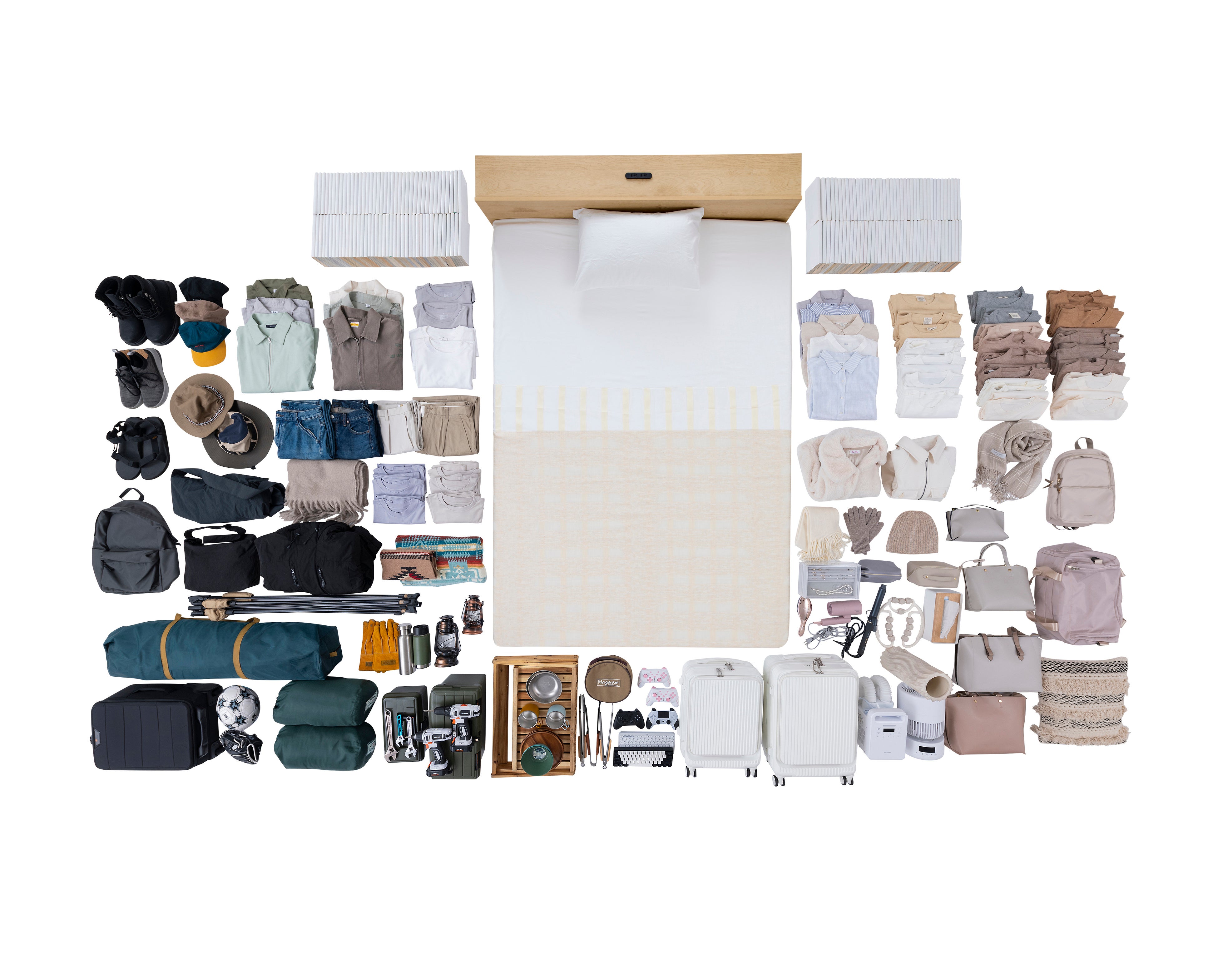 今回発売する「超収納ベッド」は、収納宮タイプ(※6)、宮有りタイプ(※7)、宮無しタイプ(※8)の3種類を展開しており、いずれも当社最大の引き出し容量と収納容量を実現しています。たとえば、「超収納ベッド 収納宮 ダブルサイズ」は、当社で初めて採用したフット引き出しを含む合計10個の引き出しにより、引き出し容量約633.3L(※1)、さらに、すのこ下のフリースペースを含めると約864.4L(※2)となり、収納容量は当社で販売するウッドトップチェスト(※3)換算で約8.6個分の収納力を実現しています。この収納力により、オフシーズンの衣類や来客時の布団、キャリーケースなども収納できます。初めての一人暮らしやワンルームの限られた空間でも使いやすい収納設計で、スペースを有効活用できます。