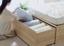 また、すべてのラインアップに共通するすのこ下のフリースペースは、ベッド全長の約2/3のみを可動式にすることで、ベッドに敷いた三つ折りマットレスをすべて動かさずに収納物を取り出せるため、出し入れが手軽です。さらに、引き出しは上部に手を掛ける部分があるので、屈まずに簡単に引き出せます。