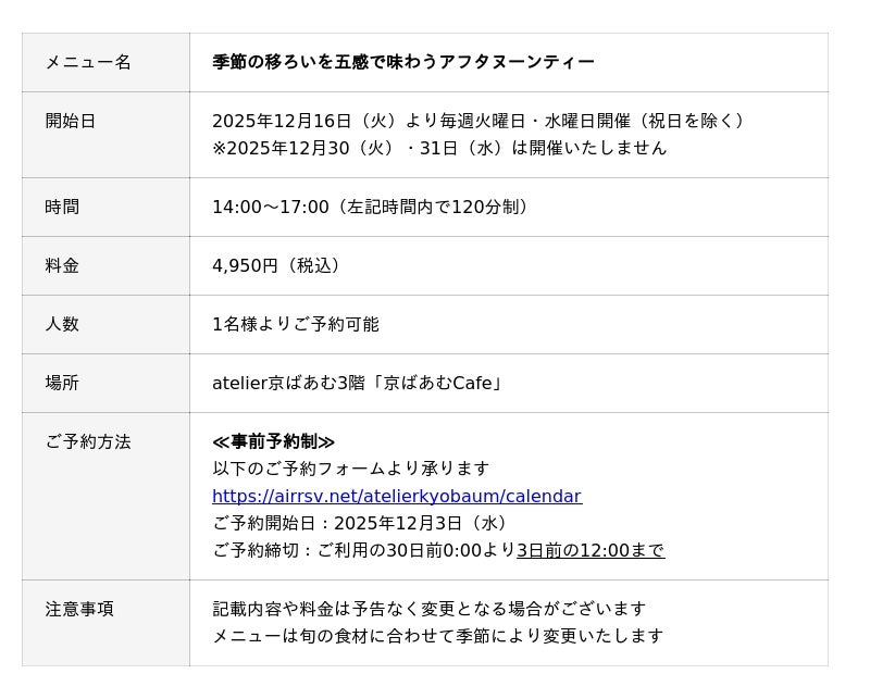 2025年12月16日(火)より、atelier京ばあむ3階「京ばあむCafe」にて、優しさ、ぬくもり、発見、余韻をテーマに、週に2日間しか出会えない特別なティータイムを提供します