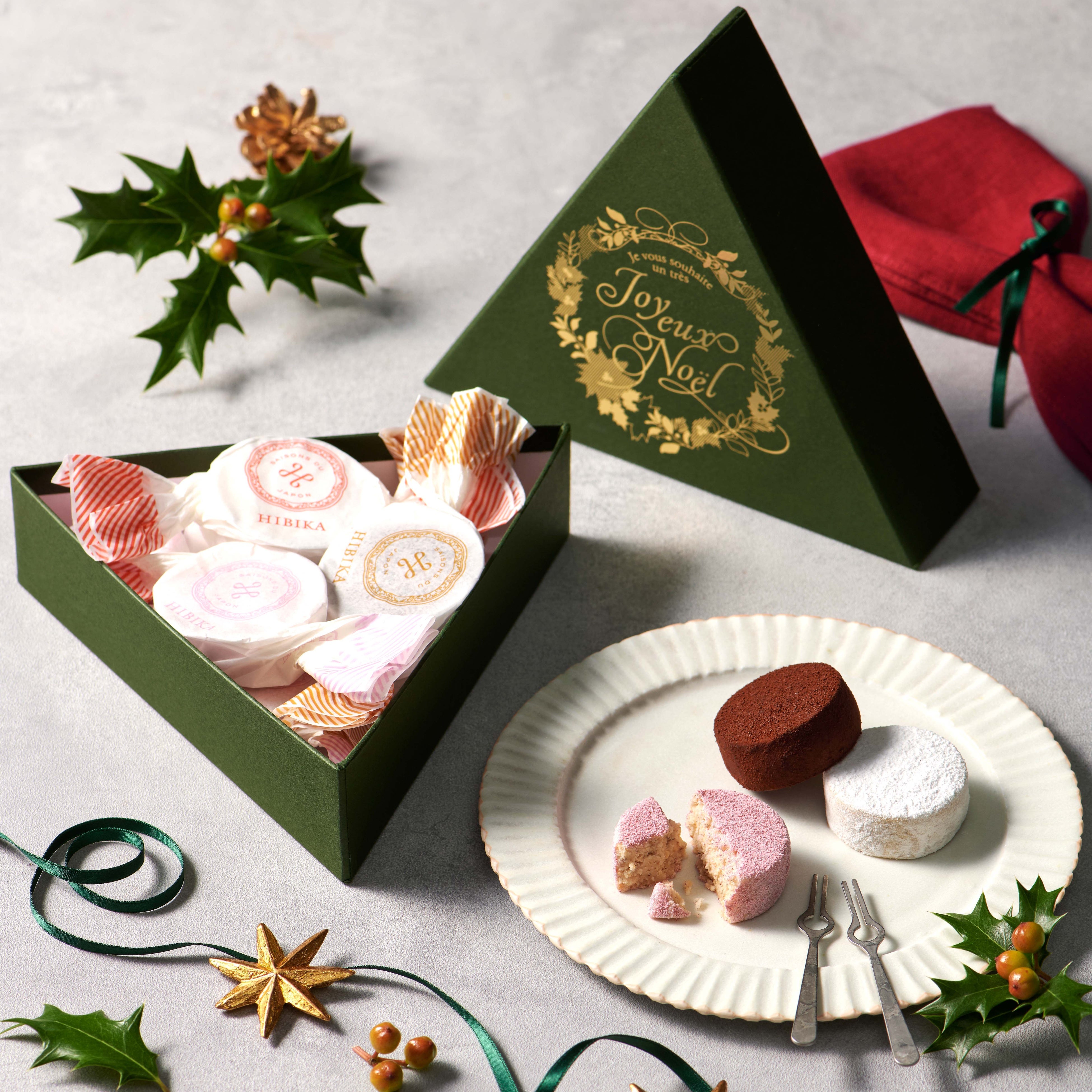 HIBIKAでは、家族や恋人、友人など、大切なひとと過ごすクリスマスが素敵な1日になりますように、という気持ちを込めて、クリスマスギフトをご用意いたします。冬のポルボロン〈ノエル〉は、クリスマス限定の新フレーバー・フランボワーズと季節の味わいヘーゼルナッツ、ショコラを詰め合わせました。