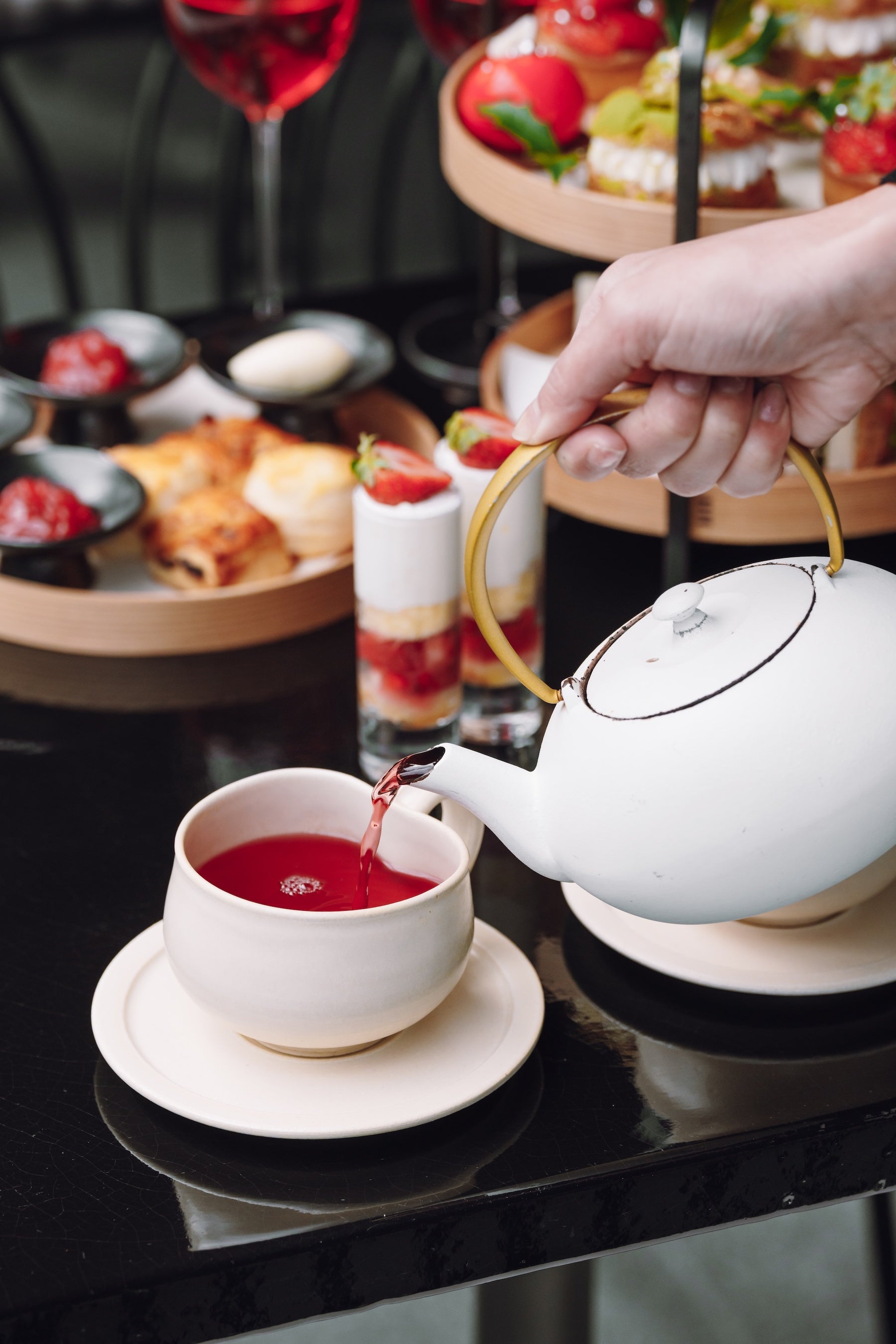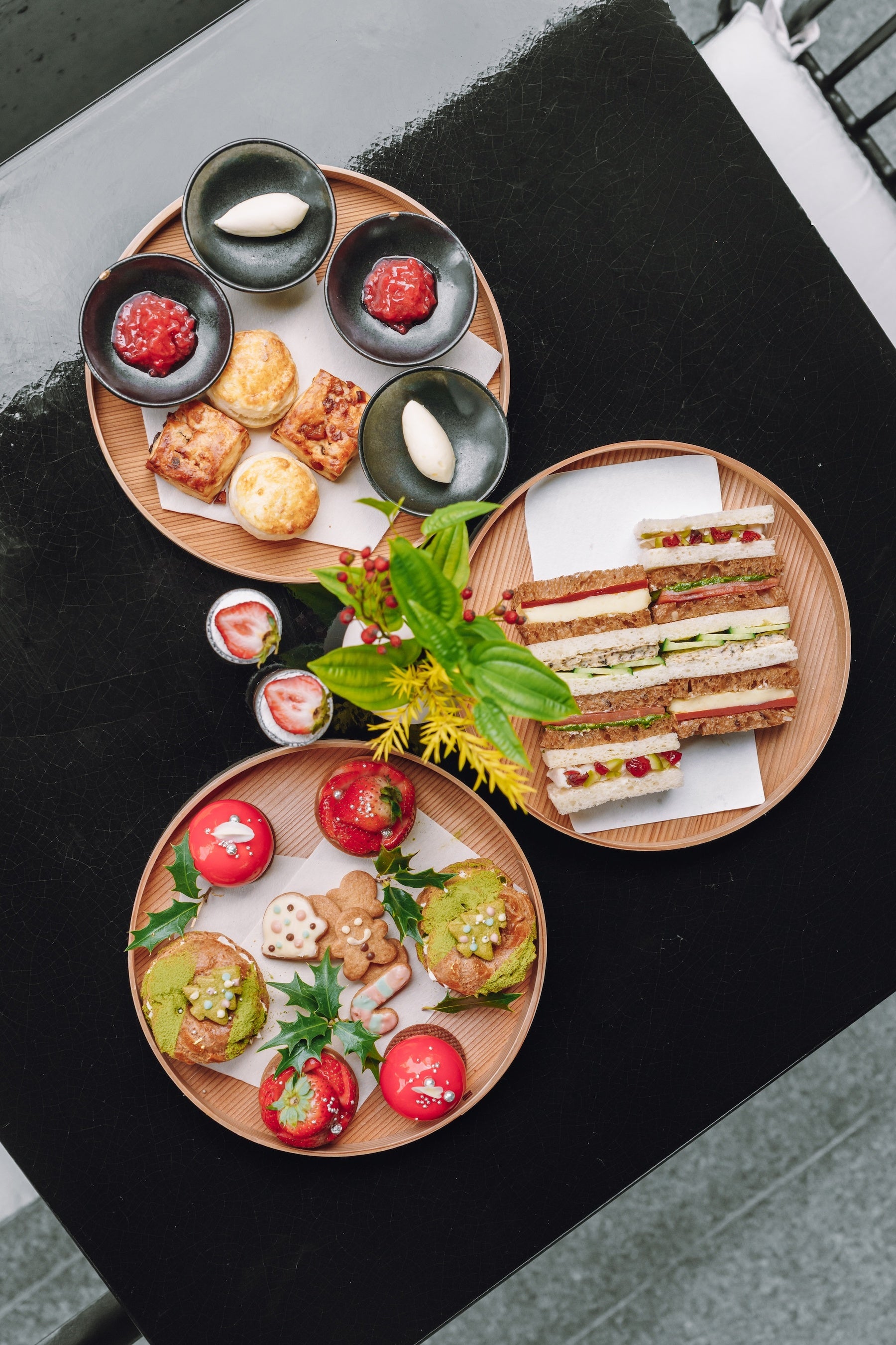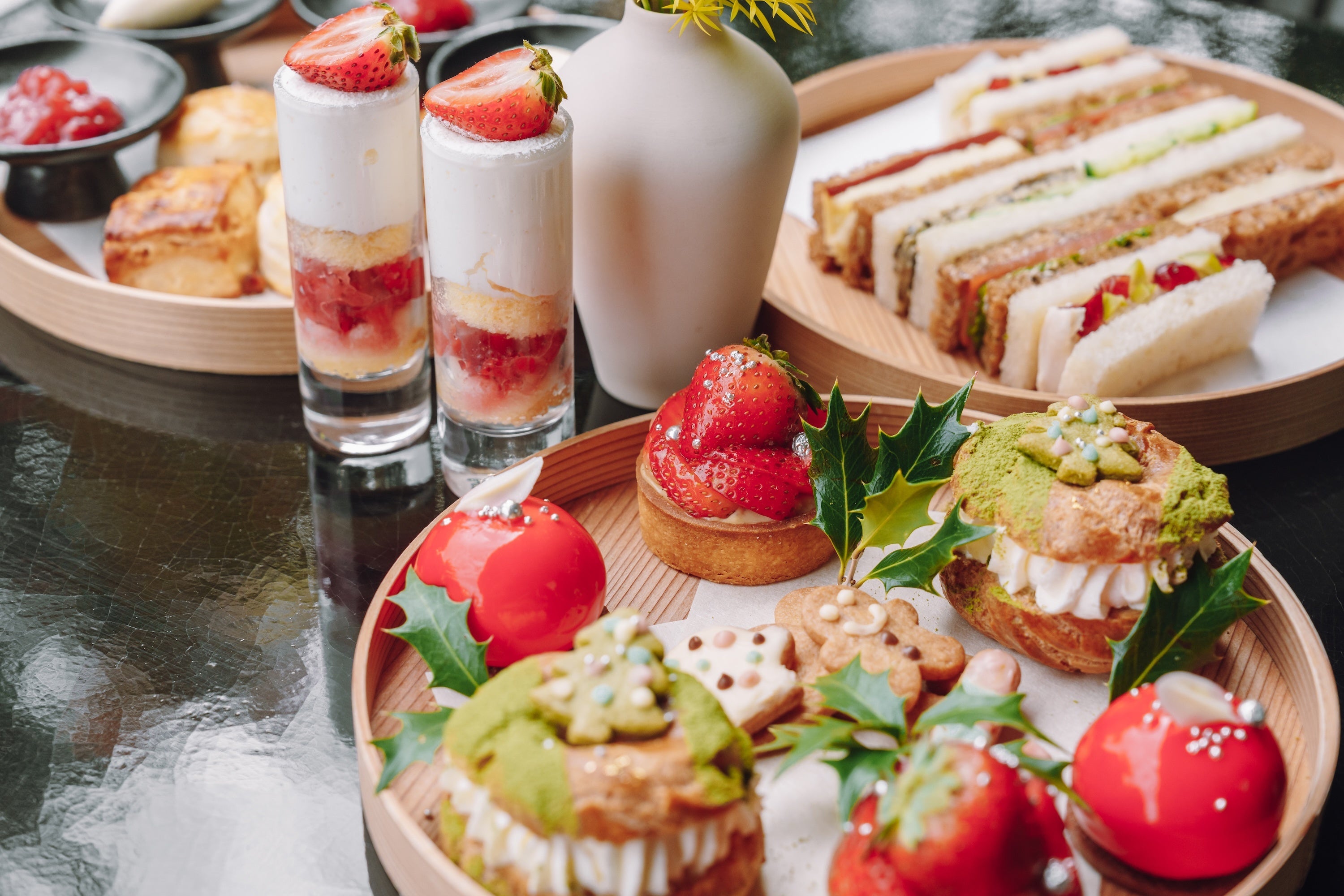 フェスティブシーズンを象徴する苺や旬の素材をふんだんに使用したペストリーとセイボリーが、テーブルに華やかな彩りを添えます。スコーンは、スパイスの香りがほのかに広がるバターミルクとミックスフルーツを練り込み、クロテッドクリームと季節のジャムが味わいを一層引き立てます。セイボリーには、チキンに小豆島オリーブとクランベリーを合わせた香り豊かな一品や、黒トリュフの芳香が広がるエッグマヨネーズ、スモークサーモンをケールペストで爽やかに仕上げたもの、さらにスイートポテトとスモークチーズの軽やかな温もりが感じられる組み合わせなど、多様な味わいが並びます。