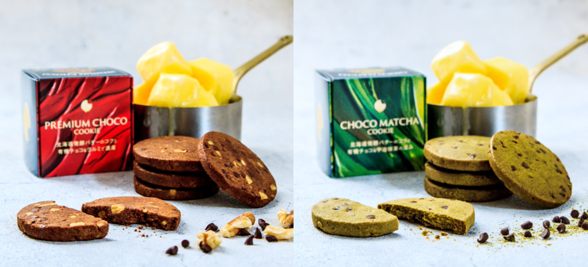 toroaの極上クッキー専門店ツキノワ星菓より、北海道発酵バター香るバターリッチクッキー新商品のチョコとくるみのクッキーと宇治抹茶とチョコのクッキーを発売