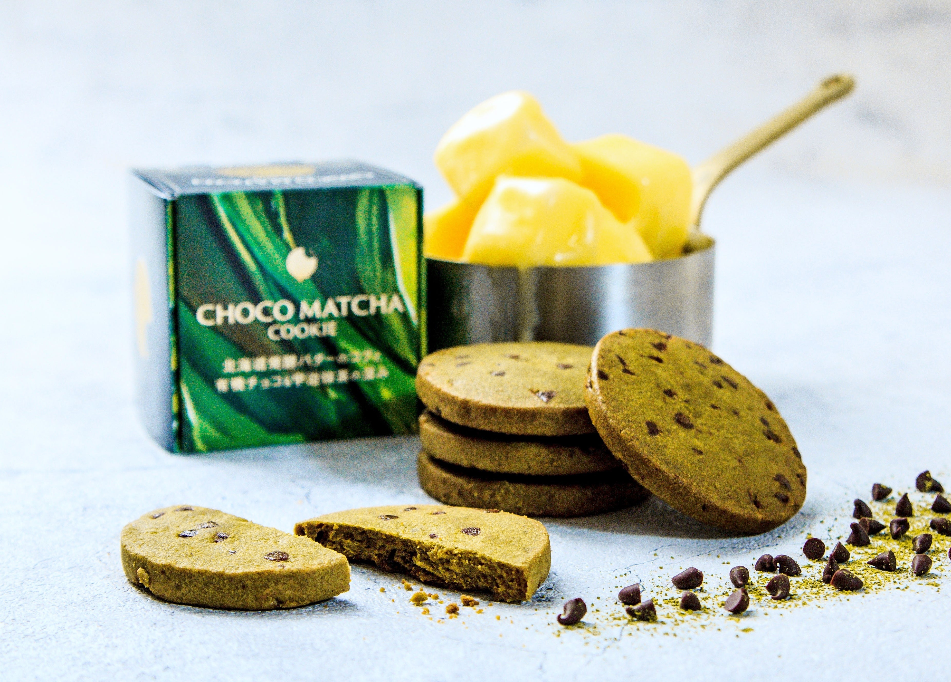 宇治抹茶とチョコのクッキーは、北海道産発酵バター100%使用、京都産宇治抹茶の豊かな甘みと滋味には北海道産の脱脂濃縮乳、少量のココアパウダーで深みを加えています。ダークチョコレートを配合しバニラ、ココナッツとメープルのシュガーで深みのある味わいです。