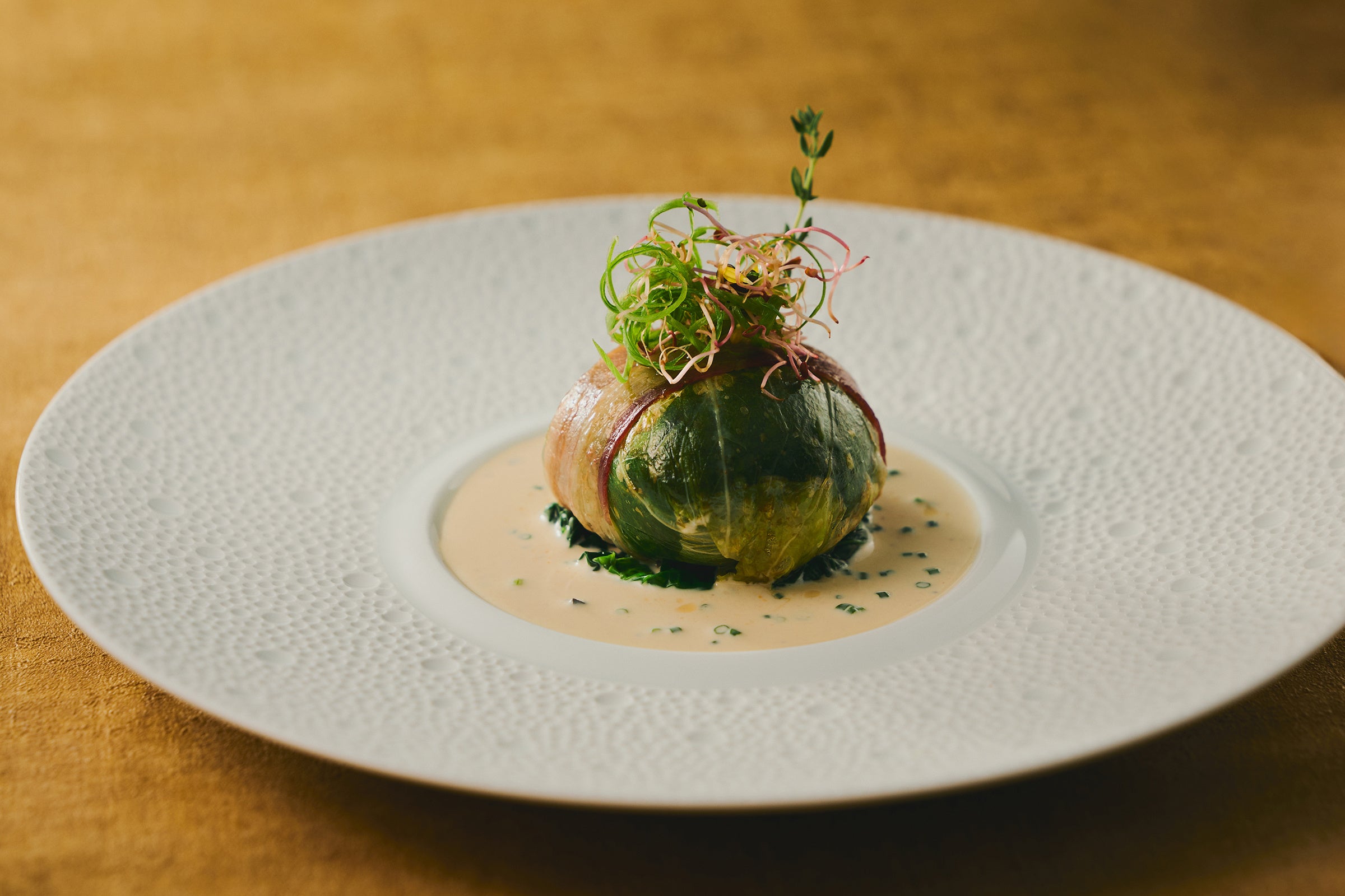 しっとりと仕上げた鯛に、海老と帆立貝のムースを合わせ、キャベツで包み込みました。トリュフの香りが漂う白ワインソースが料理に奥行きをもたらし、パンチェッタのほどよい塩味が絶妙なアクセントに。深みのある味わいが広がる一皿です。