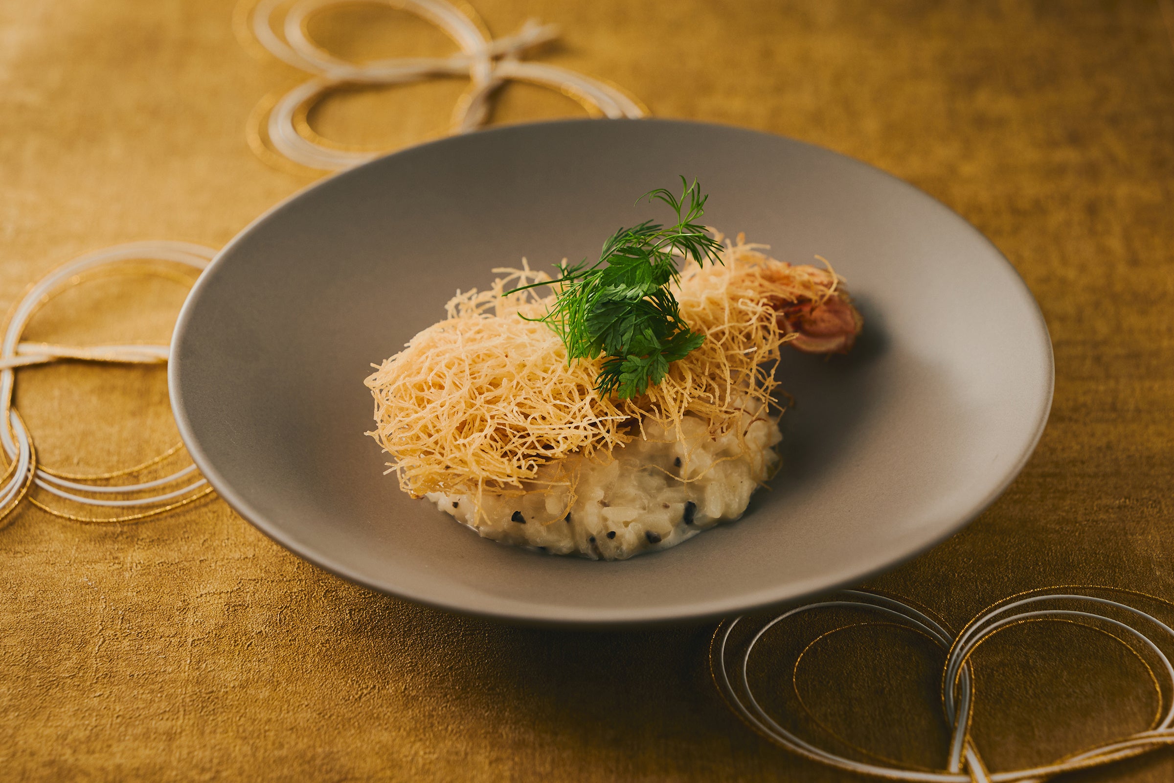 糸状の生地で包み込んだラングスティーヌは、外はサクッと香ばしく、中にはエビの甘みと旨味をぎゅっと閉じ込めて。香り高いトリュフとパルメザンチーズのコクが引き立つ、大阪産米のリゾットとともに、贅沢な味わいをご堪能ください。
