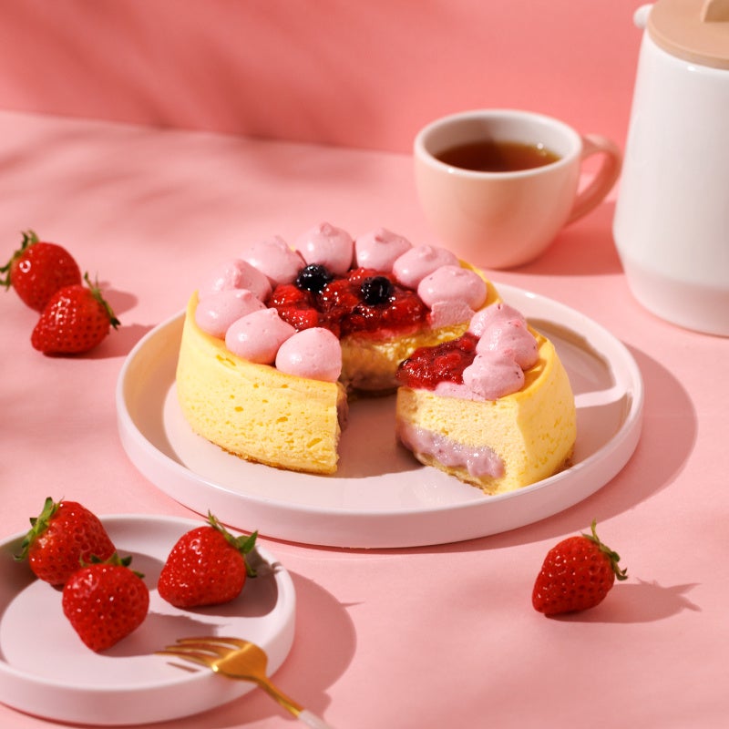 熊本・阿蘇産ジャージー牛乳を使ったミルキーなチーズスフレに、甘酸っぱい特製いちごカスタードを閉じ込めました。仕上げに口どけなめらかな苺マスカルポーネクリームと果肉感のあるベリーのコンポートをあしらい、華やかに。
