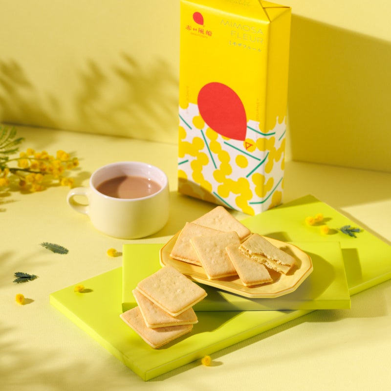 ミルキーなクリームチーズ風味のチョコ※をサクッと軽い食感のチーズクッキーでサンド。ミモザの花のように黄みがかった焼き色が特長です。