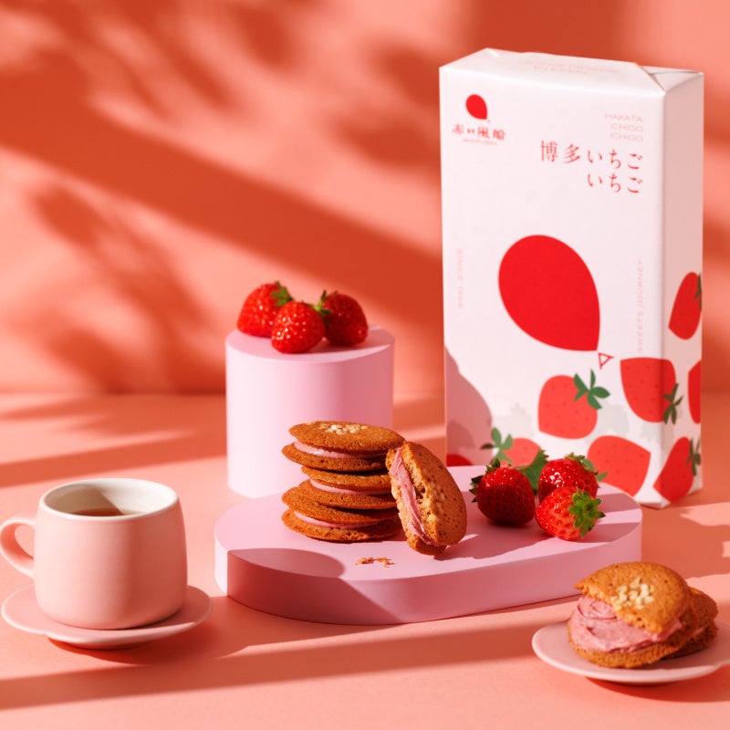 発酵バターやいちごペーストを練りこみ、風味豊かに焼き上げた苺風味のチュイールに、あまおう苺入の甘酸っぱいチョコレートをサンドしました。