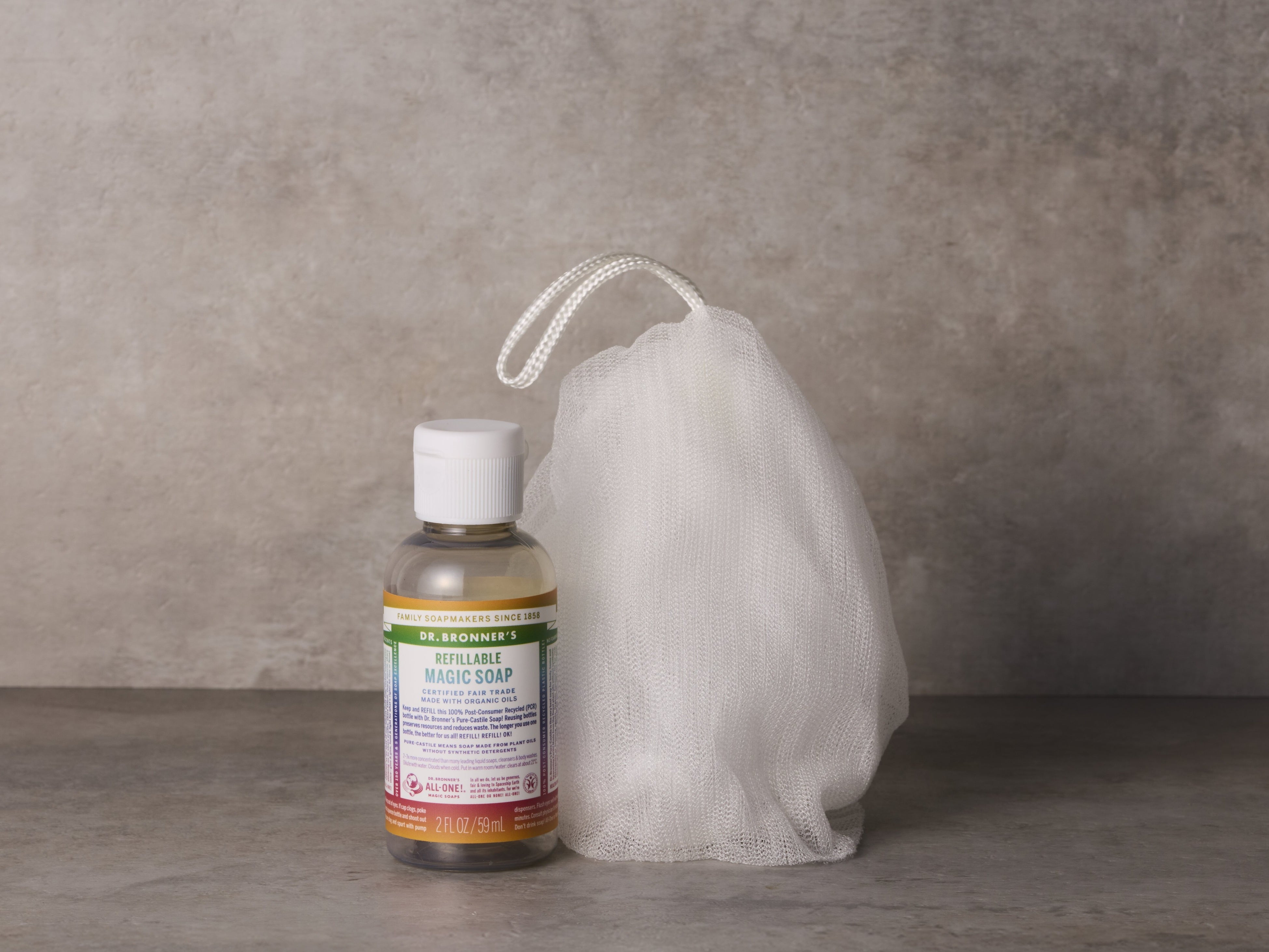 ドクターブロナー マジックソープ(数量限定セットを含む)、マジックソープバー、オーガニックシュガーソープを含む3,500円以上(税込)のご購入で、マジックソープ詰め替え用ボトル(59mLサイズ)ととうもろこし由来の洗顔用泡立てネットをプレゼントいたします。