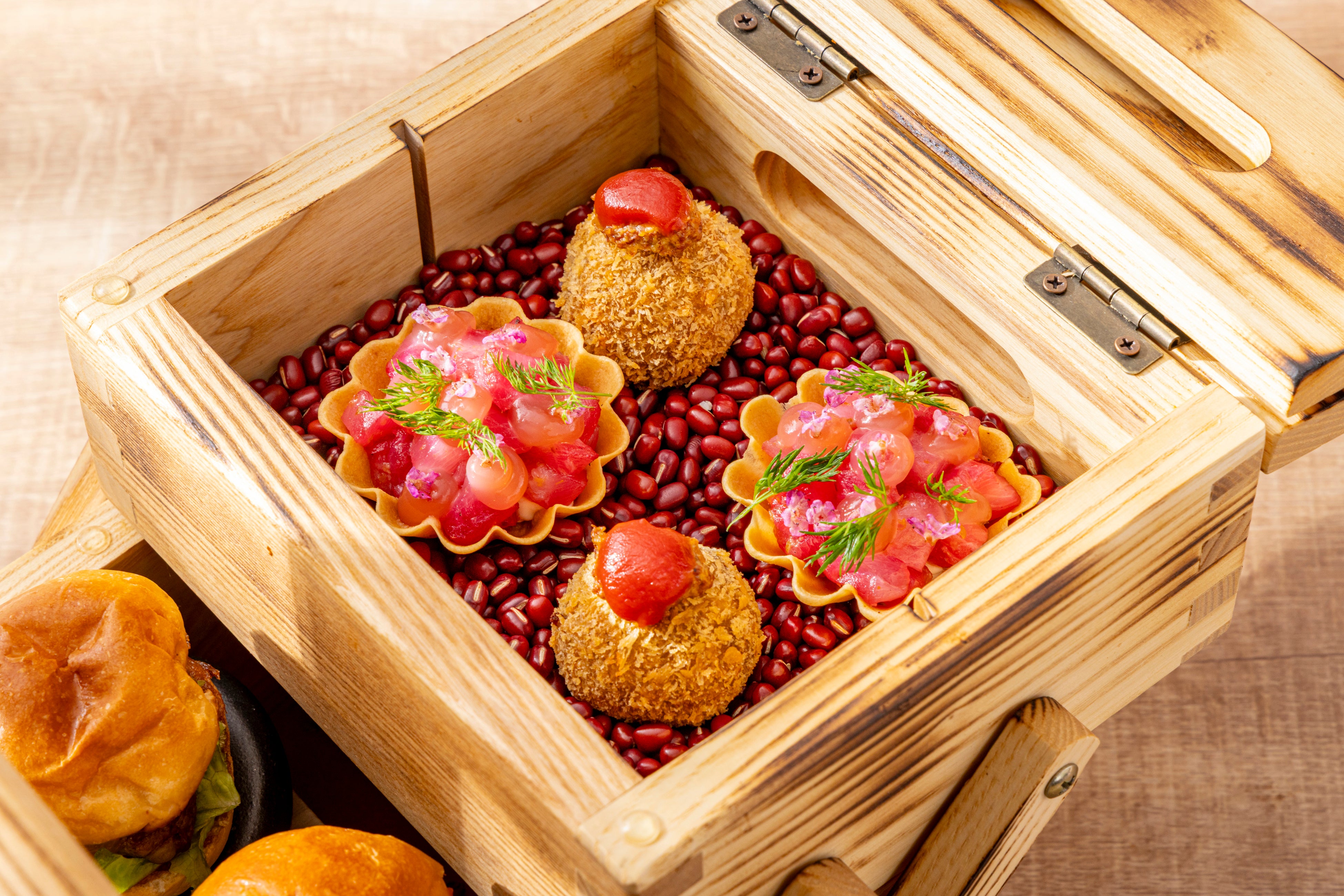 昆布締めハマチと発酵苺のタルトレット、牛肉のクロケット ストロベリーケチャップ