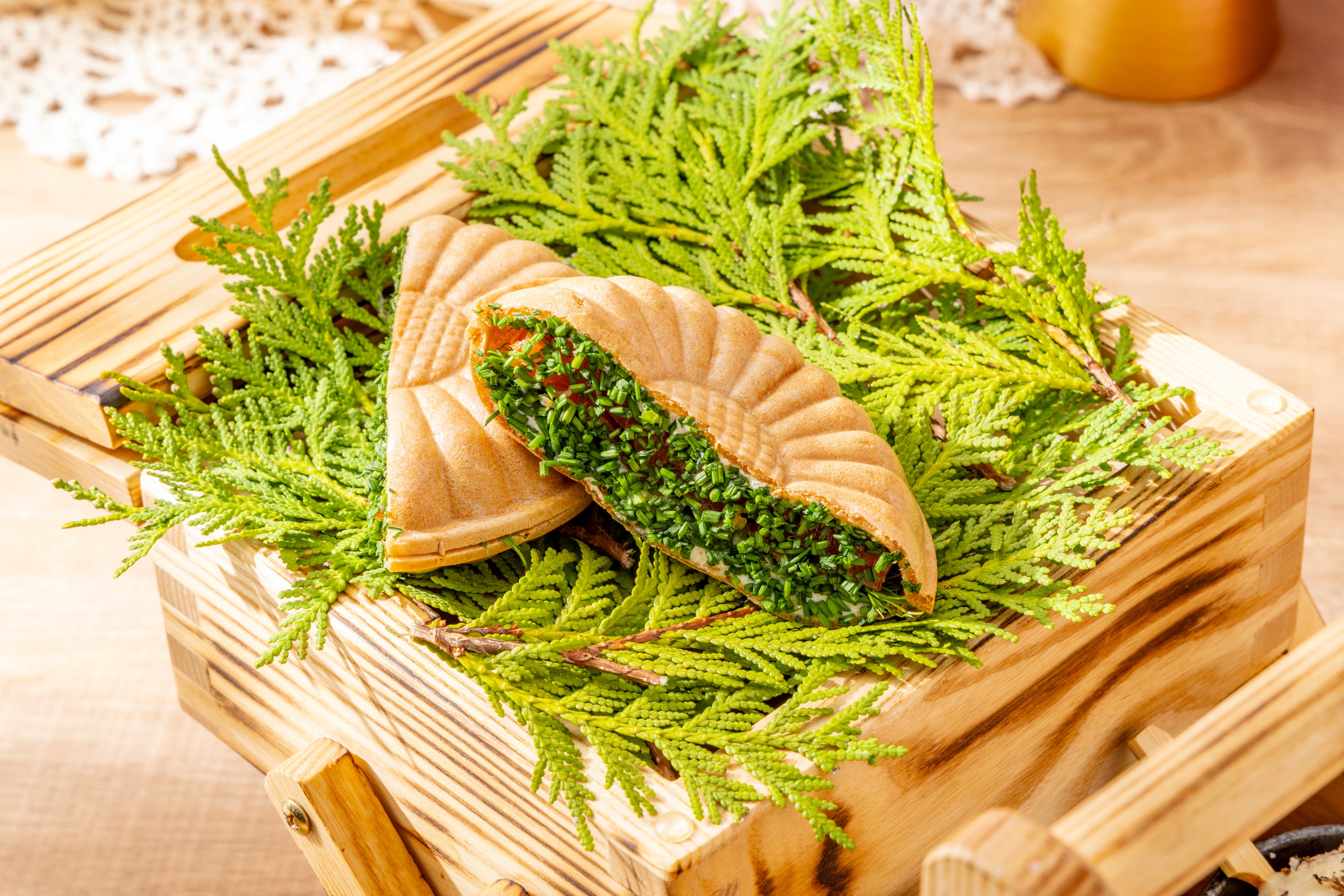 ピクニックボックスのふたを開けると、まず目に飛び込んでくるのは個性豊かな5種のセイヴォリー。爽やかな柑橘の香りを纏わせたサーモンに、オレンジマーマレードとホースラディッシュクリームを合わせ、香ばしい最中でサンドした「スモークサーモンとホースラディッシュクリームのサンドイッチ」は、メトロポリタングリルのシグニチャーを遊び心たっぷりに再解釈した一品。ディルの芳香と最中の軽やかな歯ざわりが、味わいを一層引き立てます。