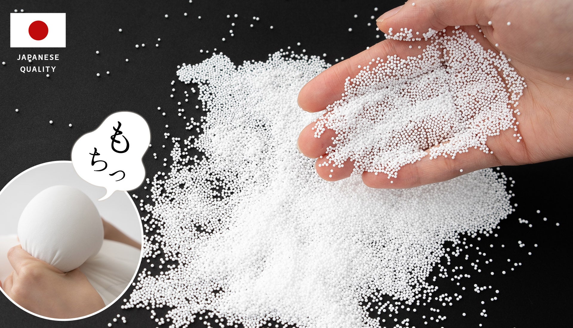 もっちもちの新触感のヒミツは、高密度の国産極小ビーズ。約0.5mmのパウダー状ビーズが、まくらの中で360°流動しながら滑らかに変形。身体にかかる負担を分散します。