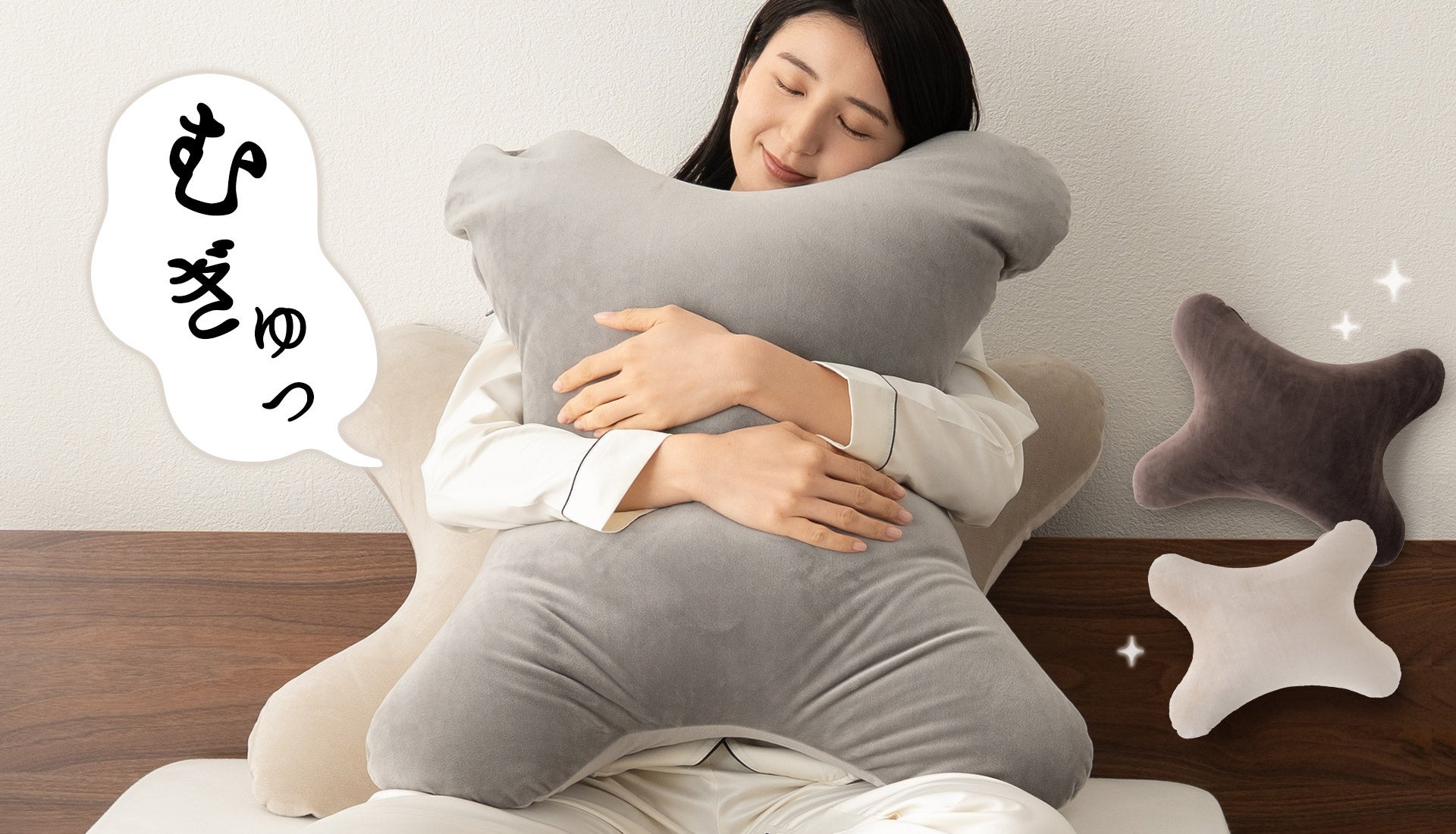毎日の自宅でのリラックス時間をもっと上質に、一日頑張った自分へのご褒美として抱き心地をとことん追求。『至福の睡眠 マシュマロ 抱きしめピロー』は、抱きつきやすい独自のクロス型形状ともっちり触感で、毎日のリラックスクッションとして日常に癒しと安心感をプラスします。