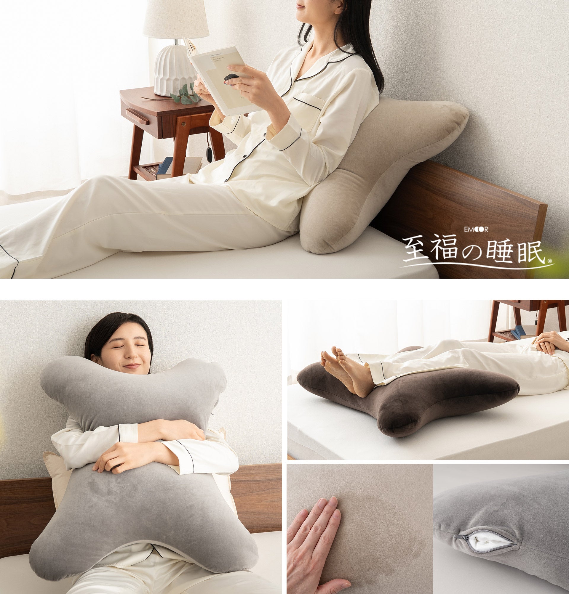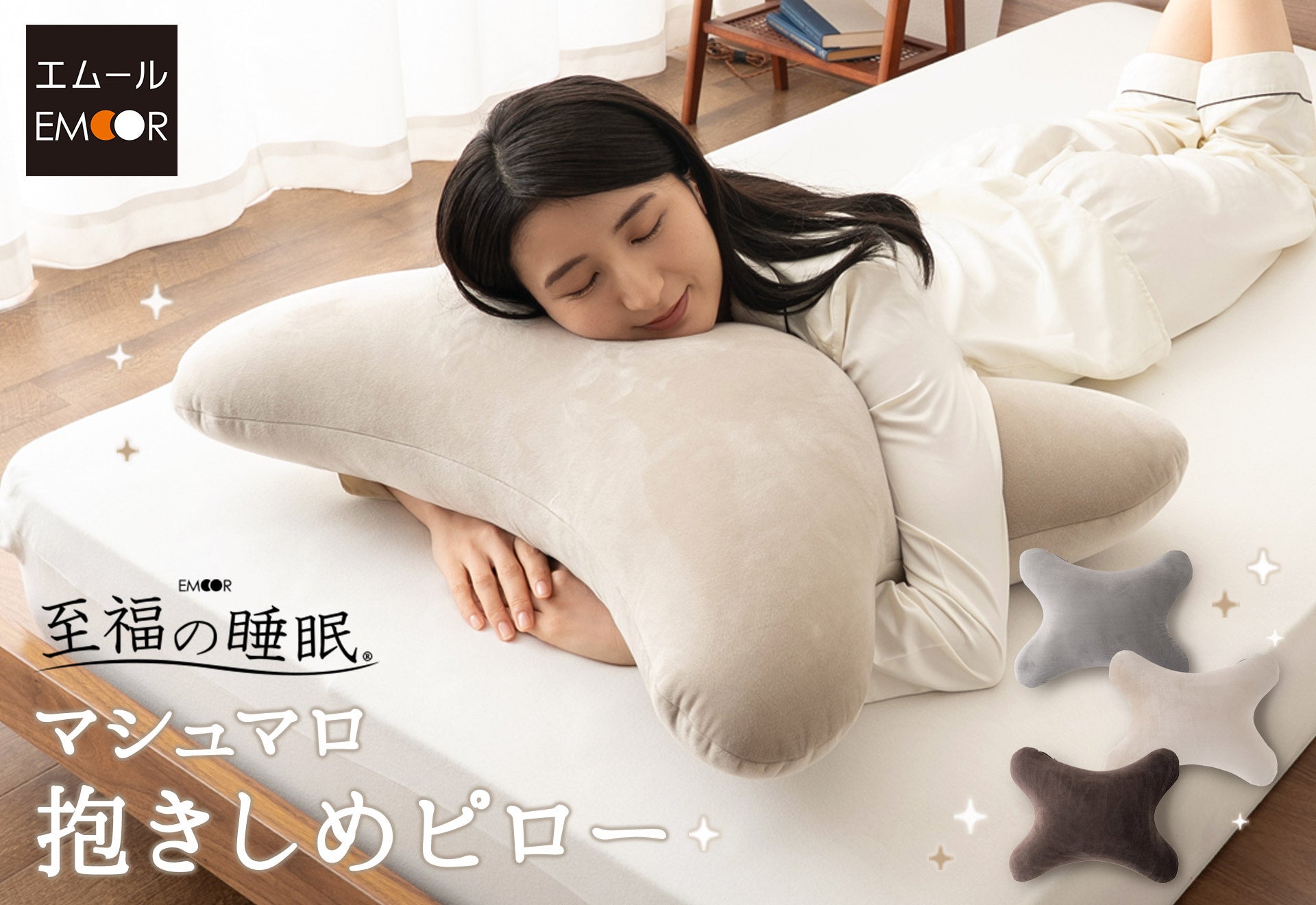 「寝る・座る・たたむ」に専門性をもつ健康家具ブランドEMOORを展開する株式会社エムール(東京都立川市:代表取締役 高橋 幸司/以下エムール)は、2025年12月3日より、抱きしめることで心がゆるむ、やさしいフィット感を追求したクッション『至福の睡眠 マシュマロ 抱きしめピロー』の販売を開始しました。国産ビーズをたっぷり使ったもちもちの触感と、抱きつきやすいクロス型デザインが魅力です。