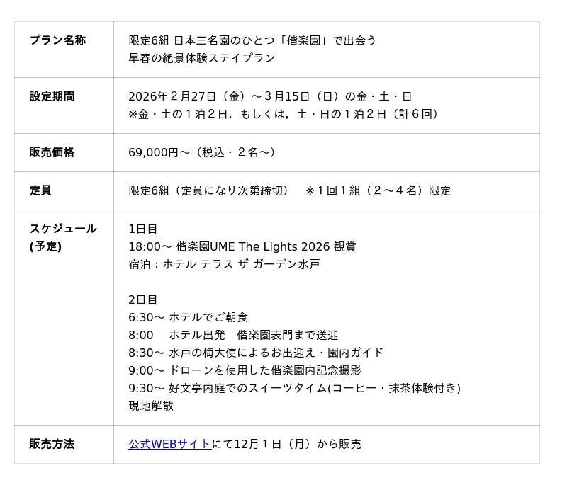 本プランは、幻想的な夜のライトアップイベント「偕楽園UME The Lights 2026」の観賞に加え、翌朝には「水戸の梅大使」による偕楽園内ガイド、ドローンによる記念撮影、さらには普段は立ち入ることのできない「好文亭 内庭」でのスイーツ・抹茶体験など、歴史ある「水戸の梅まつり」の新しい楽しみ方を凝縮した特別なステイプランです。