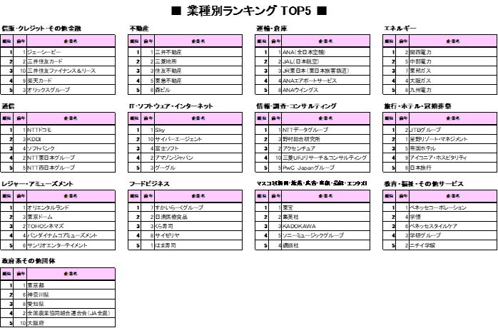 「信販・クレジット・その他金融」では、三井住友ファイナンス&リース(前年10位→3位)と楽天カード(同9位→4位)がランクイン。「エネルギー」は前年トップの東京ガスが圏外となり、関西電力が2位から1位に。東邦ガス(同7位→3位)、九州電力(同8位→5位)が入りました。「IT・ソフトウェア・インターネット」ではサイバーエージェントが前年10位から2位へジャンプアップ。「情報・調査・コンサルティング」は三菱UFJリサーチ&コンサルティングが前年10位から4位入り。唯一すべての順位が入れ替わり変動が大きかったのが「旅行・ホテル・冠婚葬祭」。前年トップの星野リゾート・マネジメントと2位だったJTBグループの順位が入れ替わり、アイコニア・ホスピタリティ(同9位→4位)、日本旅行(同6位→5位)がランクインしました。「フードビジネス」は、前年7位のすかいらーくグループがトップとなり、サイゼリヤが8位から4位に。「政府系その他団体」は大都市を抱える3団体が新たにランクイン。神奈川県(前年6位→2位)、愛知県(同8位→2位)に加え、関西・大阪万博で盛り上がった大阪府も前年の10位から5位に入りました。