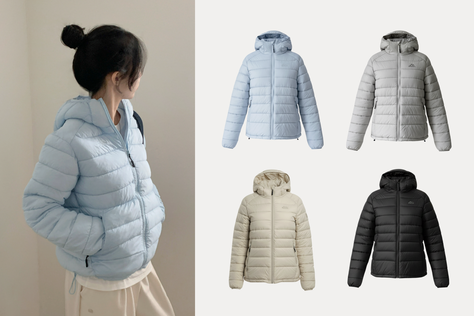 一般的に冬物のアウターはモノトーンが多いですが、今年は「パステルトーンの軽量ダウン」がシーズンの人気トレンドとして注目を集めています。単調なモノトーンから抜け出し、明るく華やかなアクセントを加えられる上、何よりも軽くてトレンディなデザインであるため、韓国では品切れが続くほどその人気が持続しています。