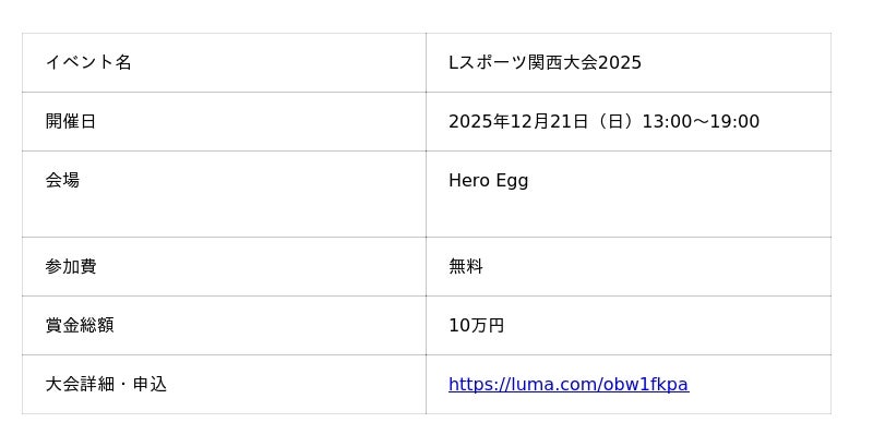 株式会社Meta Heroes(本社所在地:大阪府大阪市、代表取締役:松石和俊、以下「当社」)は、次世代のDX人材育成を目指し、学生向けのITスキルコンテスト「Lスポーツ関西大会2025」を2025年12月21日(日)に、当社が運営するDX教育施設「Hero Egg」内(eスタジアムなんば本店)にて開催いたします。