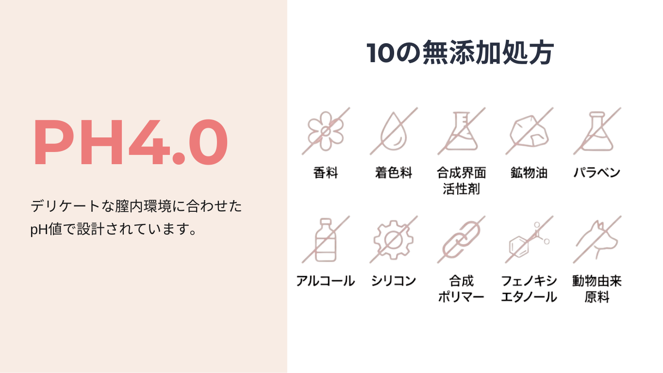 本製品は、デリケートゾーンという極めて繊細な部位へ使用することを前提に、安全性を最優先に設計いたしました。弱酸性&10の無添加処方
