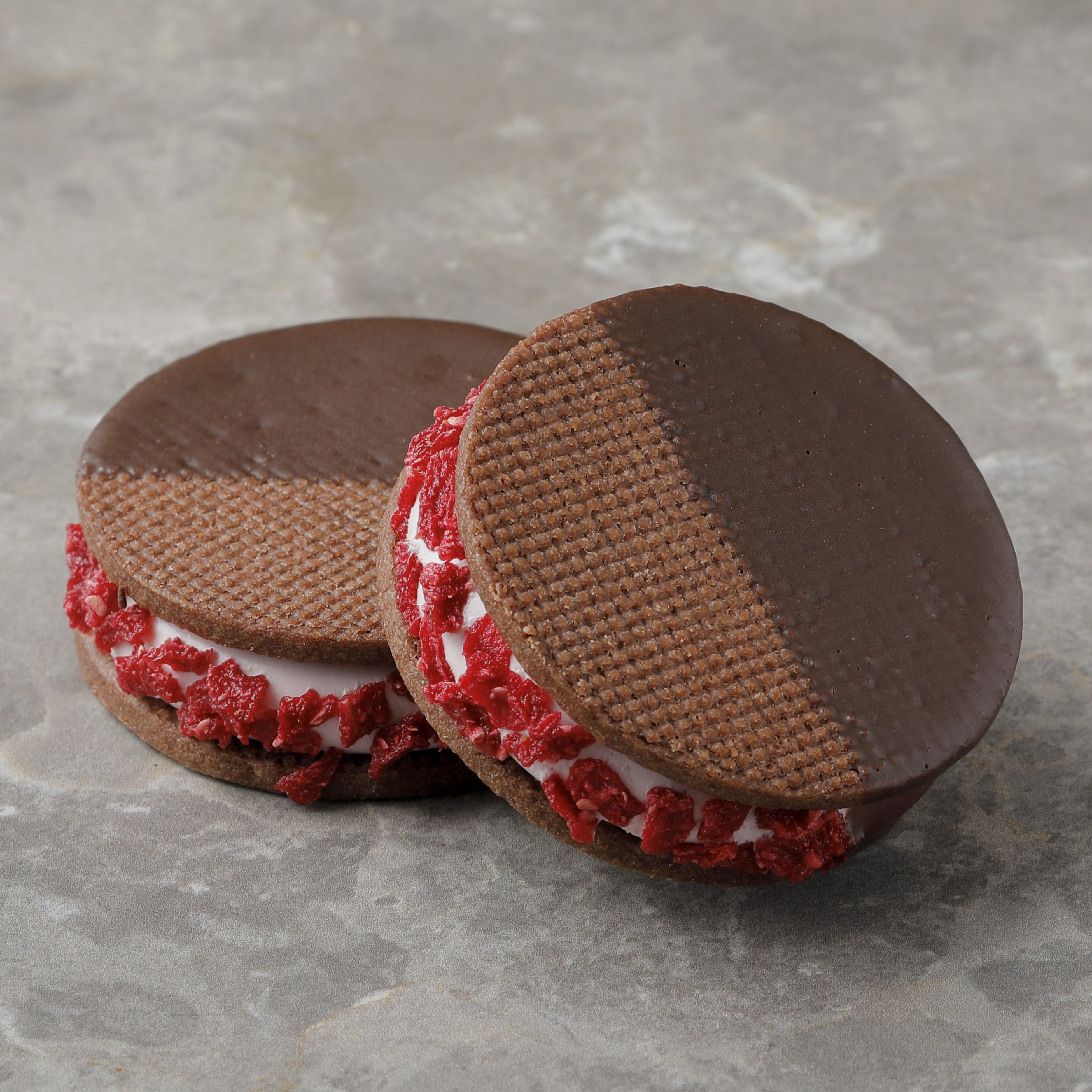 ギモーヴクッキーサンドココアといちごの王道コンビネーション。ストロベリーとフランボワーズで仕上げたマシュマロを、ほろ苦いココアクッキーでサンドしました。マシュマロの中には優しい甘さのベリーコンフィチュールを合わせ、深みのあるココアの香りと果実の爽やかな酸味が奏でる幸せなハーモニーをお届けします。