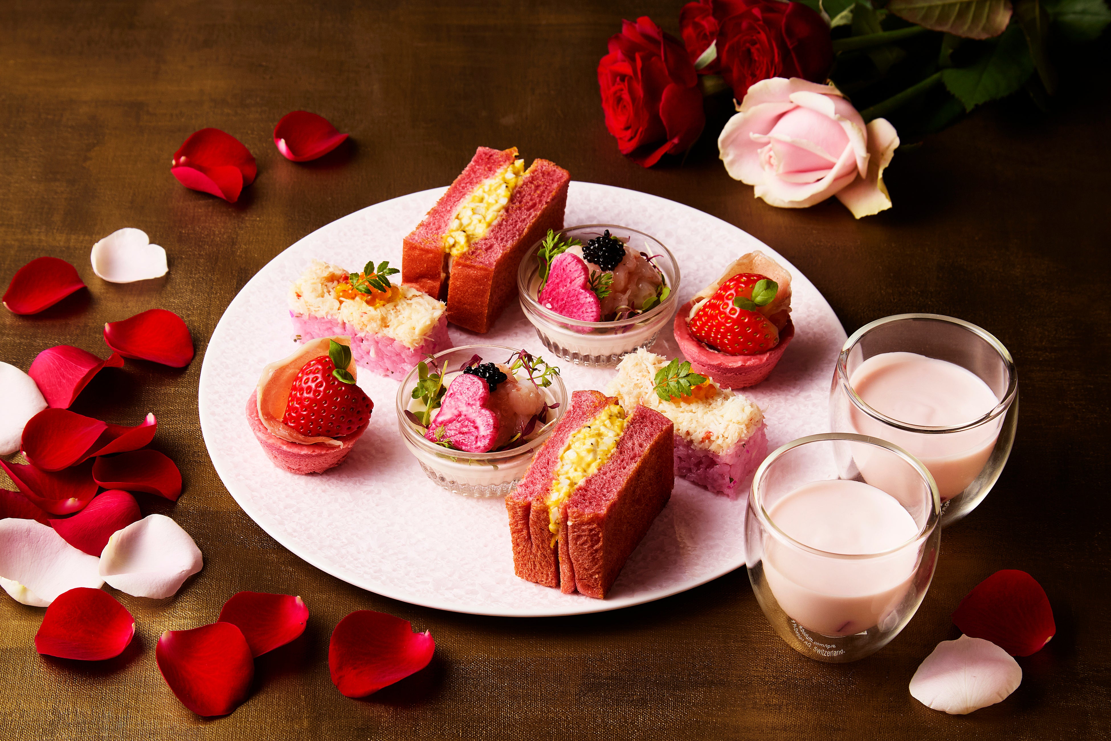 セイボリーにもバレンタインらしい、季節の食材を使用した華やかなアイテムが並びます。最初にサーブされるのは、寒さが厳しくなる冬においしさが増すカリフラワーを使った「カリフラワーとビーツのスープ」。まろやかなカリフラワースープをベースに、ビーツの自然な甘みを加えることで、やさしくまろやかな口当たりと美しいピンク色に仕上げました。毎年ご好評をいただいている「ベリーローフとトリュフ卵サンドイッチ」が今年も登場します。軽くトーストしたベリーローフに、芳醇な香りのトリュフを贅沢に加えた卵サンドは、素材の魅力が引き立つ上品な味わいです。旬を迎えて身が引き締まり、甘みが増す甘エビを使った「甘エビのタルタル かぶムース キャビア」は、かぶのムースに甘エビのタルタルを重ね、キャビアを添えることで、奥行きある風味を持たせた一品です。ハートにくりぬいた紅心大根をデコレーションに添えて、食感の変化も楽しめます。「いちごとモッツアレラと生ハム 25年バルサミコとビーツタルト」は、ピンクのビーツタルトに25年熟成バルサミコ酢を流し、生ハムを巻いたいちごとモッツァレラを入れています。貴重な25年熟成バルサミコ酢が、味のアクセントとして深みを加えています。「ズワイガニの押し寿司 わさびキャビアとトラウトキャビア」は、ビーツでピンク色に染めた寿司に、旬のズワイガニを乗せた一品です。わさびが香るキャビアとトラウトキャビアを添えており、一口ほおばるとわさびの香りがふわりと広がります。