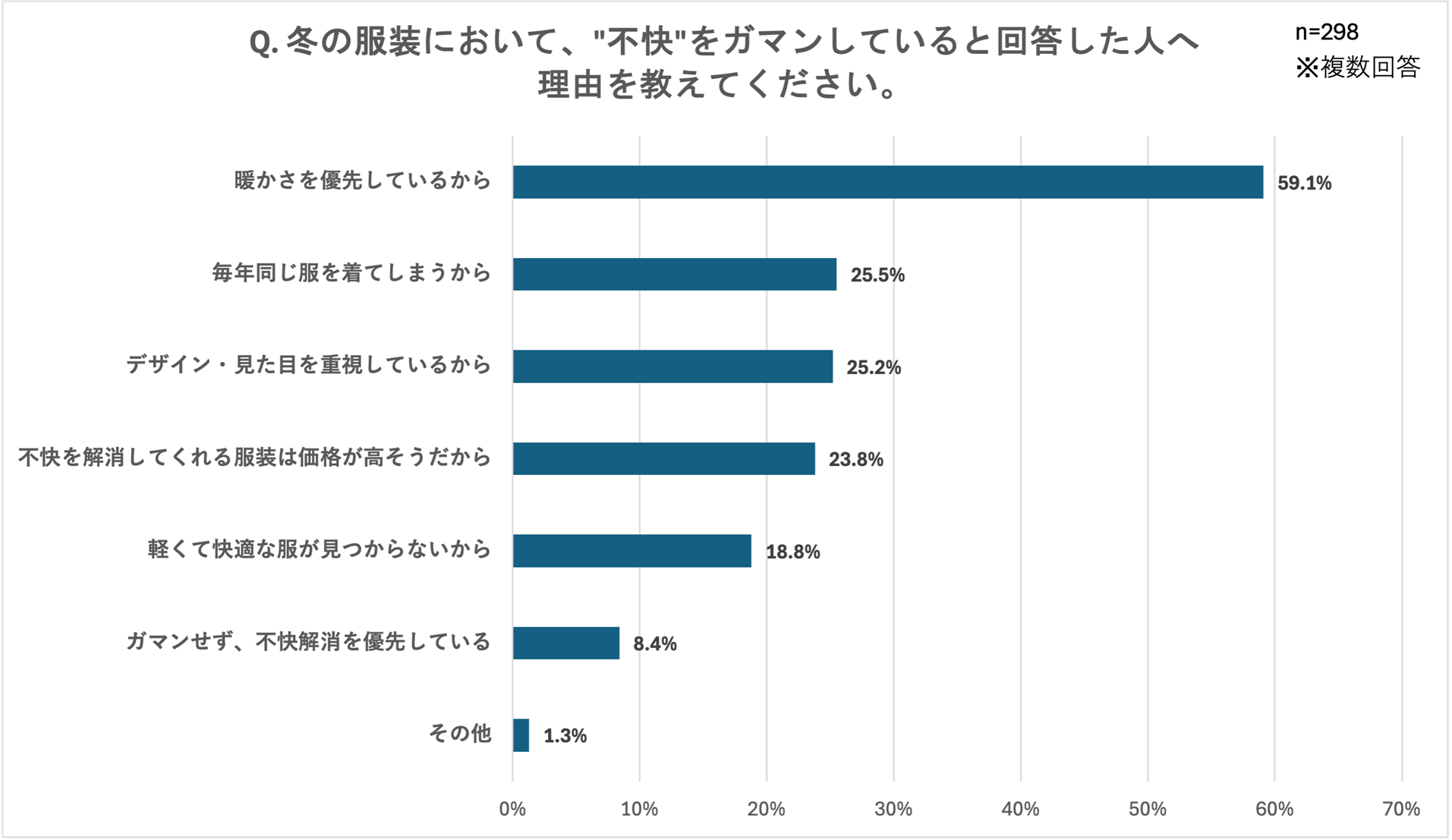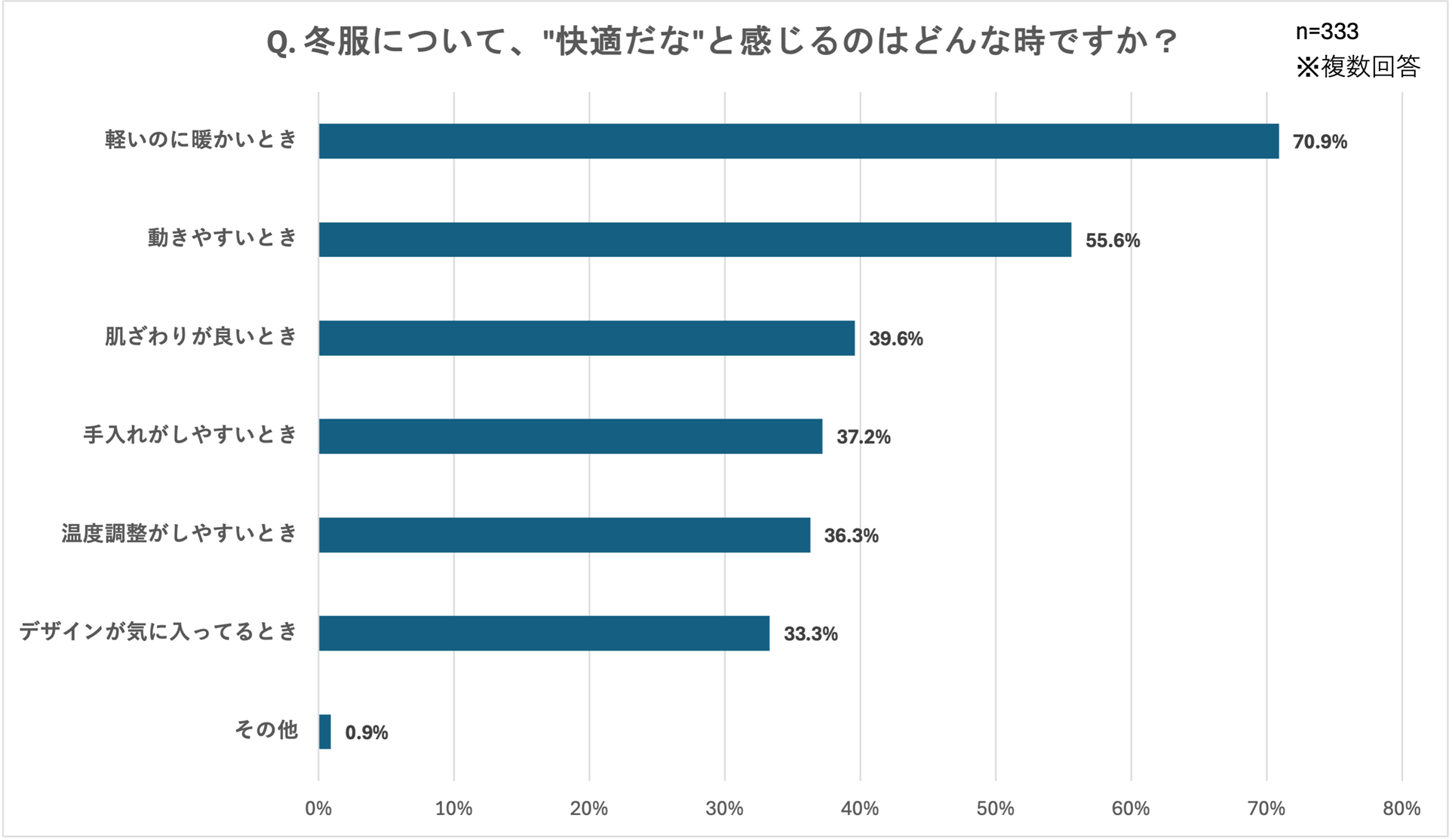 ここまで、冬の服装において不快さを感じているものの防寒も欠かせない、といった声が多いことが明らかになりましたが、さらに「”不快”をガマンしている理由を教えてください。」という設問には、「暖かさを優先しているから(59.1%)」が最多となりました。また、「冬服について、”快適だな”と感じるのはどんな時ですか?」という設問では、「軽いのに暖かい時(70.9%)」が最多となり、これらの結果から、冬服選びにおける「暖かさ」と「快適さ」という、一見ジレンマの関係にある両立を求める声が強く浮き彫りになりました。
