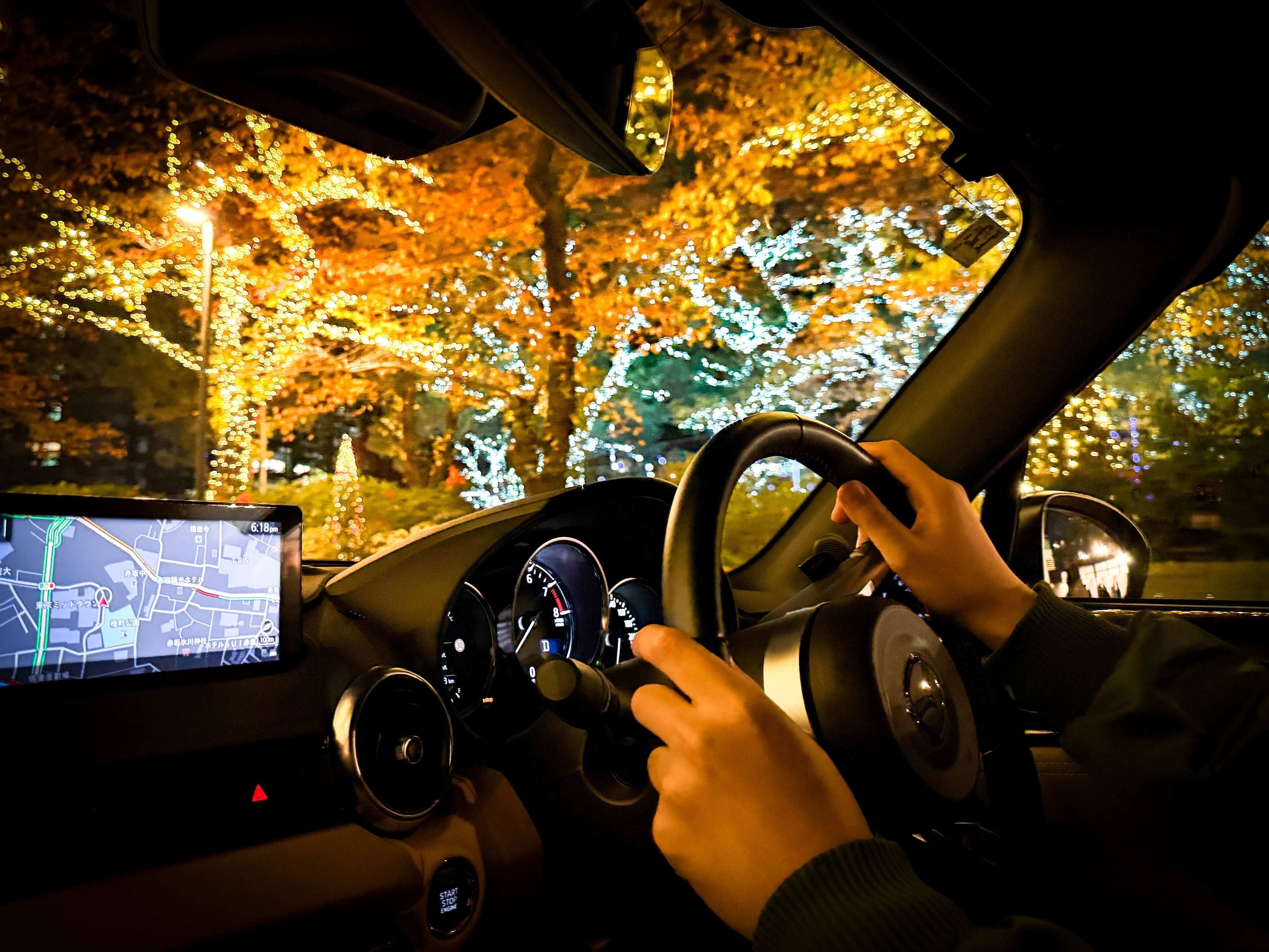 屋根いっぱいに広がるサンルーフから見えるイルミネーションは、この時期ならではの夜のドライブを引き立てます。
