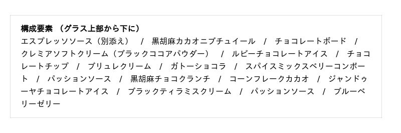 パフェの上部には、ブラックココアパウダーを纏ったクレミアソフトクリームと、ベリークリームをあしらったチョコレートテリーヌを添えました。さらに、黒胡麻入りの特製カカオニブチュイールを上部に飾り付け、見た目にもインパクトを与えつつ、黒胡麻の香ばしさとほのかな苦みで、味わいにも奥行きをもたらします。また、ほんのりと温かい別添えのエスプレッソソースを注げば、ほろ苦い大人のアフォガード風味も楽しめます。