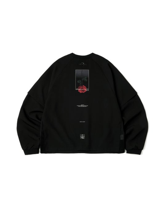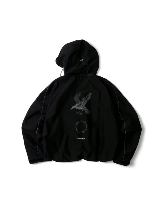 GOOPiMADEの機能素材と前衛的なデザインロジックが描く“荒野”を舞台に、咲き誇るバラと羽ばたくカラスを重ね合わせ、痩せた大地や嵐吹き荒れる環境の中でも失われることのない不屈の生命力を象徴的に表現したコレクションです。