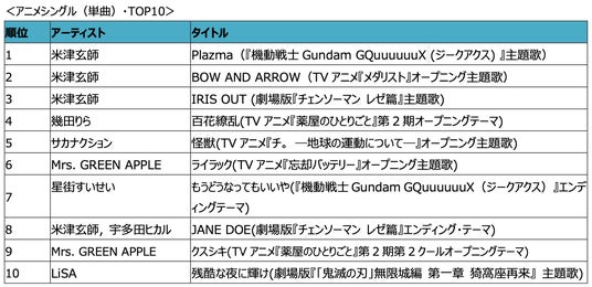 ●アニメシングル(単曲)部門では、米津玄師がTOP3を独占。1位は今年アニメ、映画ともに話題となった『機動戦士Gundam GQuuuuuuX (ジークアクス) 』主題歌である「Plazma」、2位にはTVアニメ『メダリスト』オープニング主題歌の「BOW AND ARROW」、3位には劇場版『チェンソーマン レゼ篇』主題歌の「IRIS OUT」がランクインし、圧倒的な人気を誇っています。