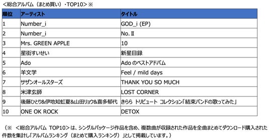 ●総合アルバム(まとめ買い)部門では、3位にMrs. GREEN APPLEのデビュー10周年記念ベストアルバム「10」がランクイン。そのほか、Adoの初ベストアルバム、サザンオールスターズ10年ぶりのオリジナルアルバムなどがランクインし、今年の音楽シーンを彩っています。