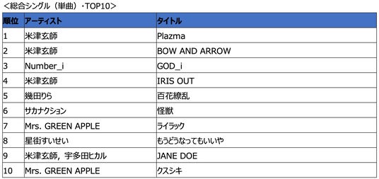 ●総合シングル(単曲)部門の2位は 首位に続き米津玄師のTVアニメ『メダリスト』オープニング主題歌の「BOW AND ARROW」、3位にはNumber_i 「GOD_i」がランクイン。そのほか劇場版『チェンソーマン レゼ篇』主題歌の米津玄師「IRIS OUT」、TVアニメ『薬屋のひとりごと』第2期オープニングテーマの幾田りら「百花繚乱」、TVアニメ『チ。 ―地球の運動について―』オープニング主題歌のサカナクション「怪獣」、TVアニメ『忘却バッテリー』オープニング主題歌のMrs. GREEN APPLE「ライラック」など、アニメ主題歌がランキング上位を席巻する結果となりました。