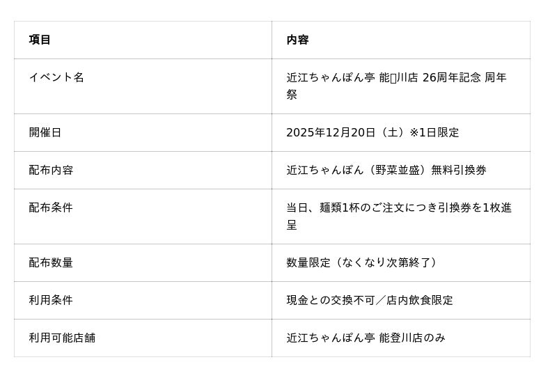 ― 26年分のご愛顧に感謝を込めて、1日限定で「近江ちゃんぽん(野菜並盛)」無料引換券を進呈 ―