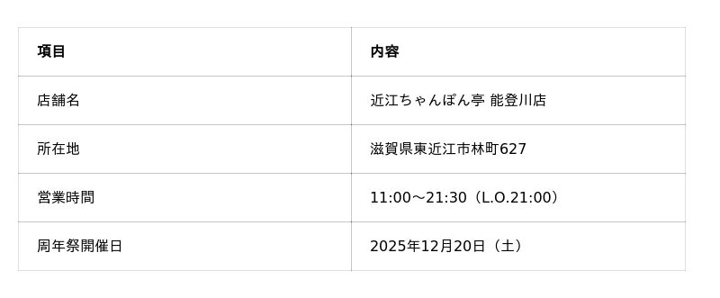 「近江ちゃんぽんをニッポンのちゃんぽんに!」を掲げるドリームフーズ株式会社(本社:滋賀県彦根市/代表取締役社長:山本英柱)は、「近江ちゃんぽん亭 能登川店」 が開店26周年を迎えることを記念し、2025年12月20日(土)に「26周年記念 周年祭」 を開催いたします。