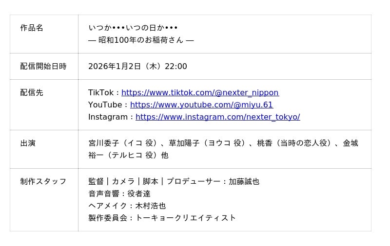 ネクスター株式会社(本社:東京都新宿区、代表取締役CEO:細田 悠巨)グループの「 TOKYO creatist 」は、2026年元旦に公開した『 いつか・・・いつの日か・・・― 終戦80年後の睦月 ― 』のスピンオフ作品として、最新作『 いつか・・・いつの日か・・・ ― 昭和100年のお稲荷さん ― 』を公開しました。本作では、現代を生きる若者が、何気なく口にするネガティブな言葉と、古来から愛される「お稲荷さん」を通じて、その背景にある五穀豊穣の祈りや、戦禍を生き抜いた先人たちの想いに触れていく物語です。