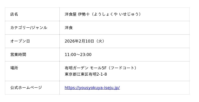 住友不動産商業マネジメント株式会社(本社:東京都新宿区 代表取締役社長:山本 直人)が運営する商業施設「住友不動産 ショッピングシティ 有明ガーデン」(所在:東京都江東区)に、世代を超えて愛される“日本の洋食”を提供する人気洋食店『洋食屋 伊勢十』が新たにオープンします。