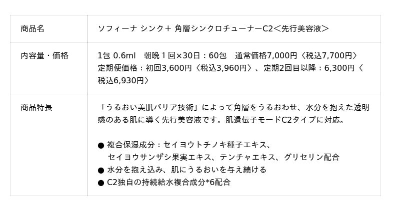 『ソフィーナ シンク+ 角層シンクロチューナー』は、スマホで素肌を撮影し、独自AIによる画像解析で分類された「肌遺伝子モード*1」からわかる、“肌の欲求*2”傾向に合わせて選ぶ先行美容液です。『ソフィーナ シンク+ 角層シンクロチューナーC1』は肌遺伝子モードC1タイプに対応。「柔肌エンハンサー技術」により、角層をうるおわせて柔らかく整え、くすみのない*4透明感のある肌へ導きます。