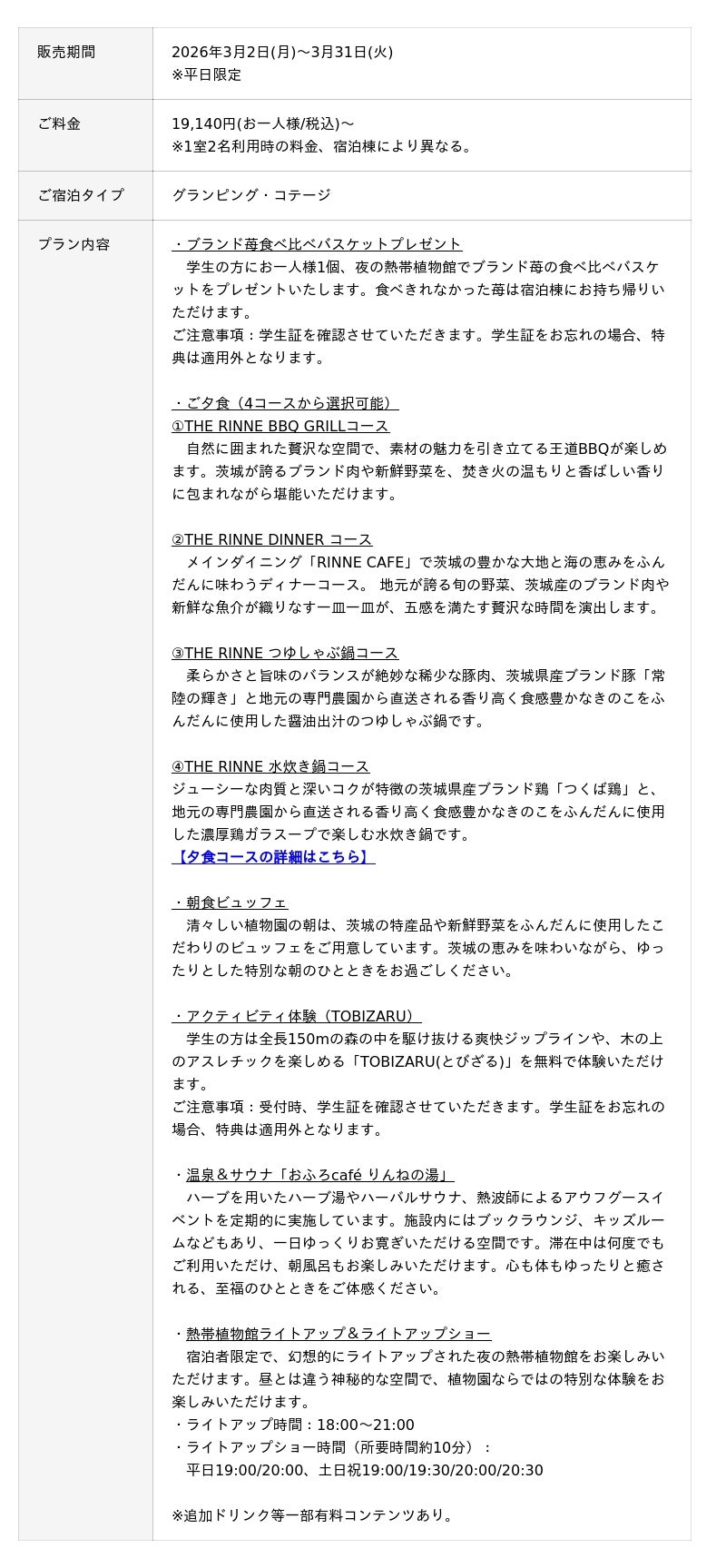 日本初の“泊まれる植物園”※1「THE BOTANICAL RESORT 林音(ザ ボタニカルリゾート リンネ)、以下:林音(リンネ)」は、2026年3月の平日限定で「学生応援!ブランド苺付きオールインクルーシブプラン」の予約を開始いたしました。本プランは、学生証をご提示いただくことで、ブランド苺の食べ比べができるバスケットを、夜の熱帯植物館でお一人様1個プレゼントいたします。本プランの最大の特徴は、宿泊者限定のライトアップショーを鑑賞しながら、旬のブランド苺を堪能できる贅沢な時間をお過ごしいただけることです。加えて、普段体験することができない植物園のナイトタイムや大自然の中でのBBQ、東日本第1位※2を受賞したおふろcafeりんねの湯や朝食ビュッフェ、アクティビティ体験などオールインクルーシブプランとして提供することで、タイパ・コスパ抜群の卒業旅行が叶います。林音(リンネ)での滞在を通して、学生の皆様の素敵な思い出作りをお手伝いします。