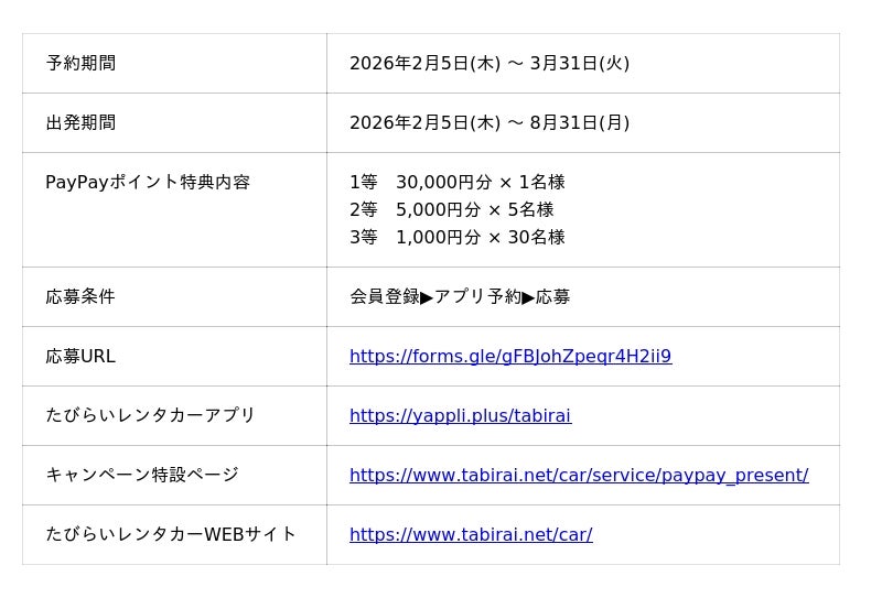 2026年2月5日(木)から3月31日(火)の期間中、「たびらいレンタカーアプリ」にてキャンペーンを実施いたします。期間中に会員登録の上、アプリからレンタカーを予約後、キャンペーンへ応募した方を対象に、抽選で36名様に最大3万円分のPayPayポイントをプレゼントいたします。