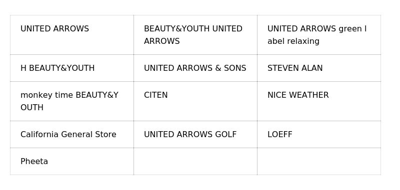 1989年創業。独自のセンスで国内外から調達したデザイナーズブランドとオリジナル企画の紳士服・婦人服および雑貨等の商品をミックスし販売するセレクトショップを運営しています。「ユナイテッドアローズ」「ビューティー&ユース ユナイテッドアローズ」「ユナイテッドアローズ グリーンレーベル リラクシング」などのブランドやレーベルを展開。