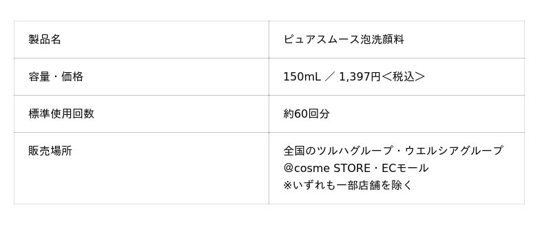 株式会社ファンケルは、3月末から「ピュアスムース泡洗顔料」(容量:150mL/価格:1,397円<税込>)を全国のツルハグループとウエルシアグループ※にて新たに発売します。また、3月から順次、@cosme STORE・ECモール※で先行発売をします。